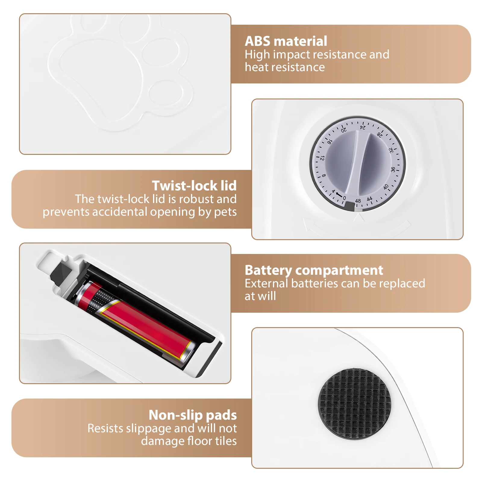 🐾💡【High Quality Material】The cat automatic feeder is made of high quality ABS material, safe and non-toxic, not afraid of falling or biting. Non-slip feet are not easy to shift and durable. The cute paw pattern is suitable to be placed in any corner of your home as a fun decoration! It is powered by one AA battery (not included in the package) and can work continuously for 6 months.