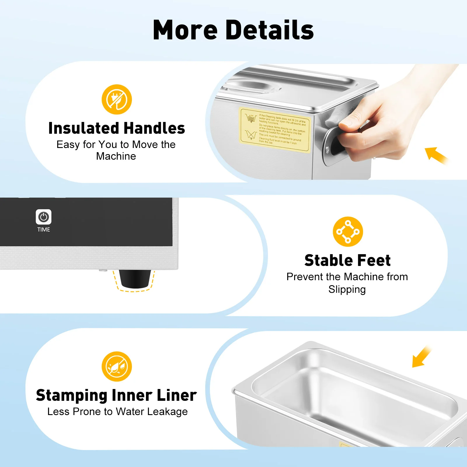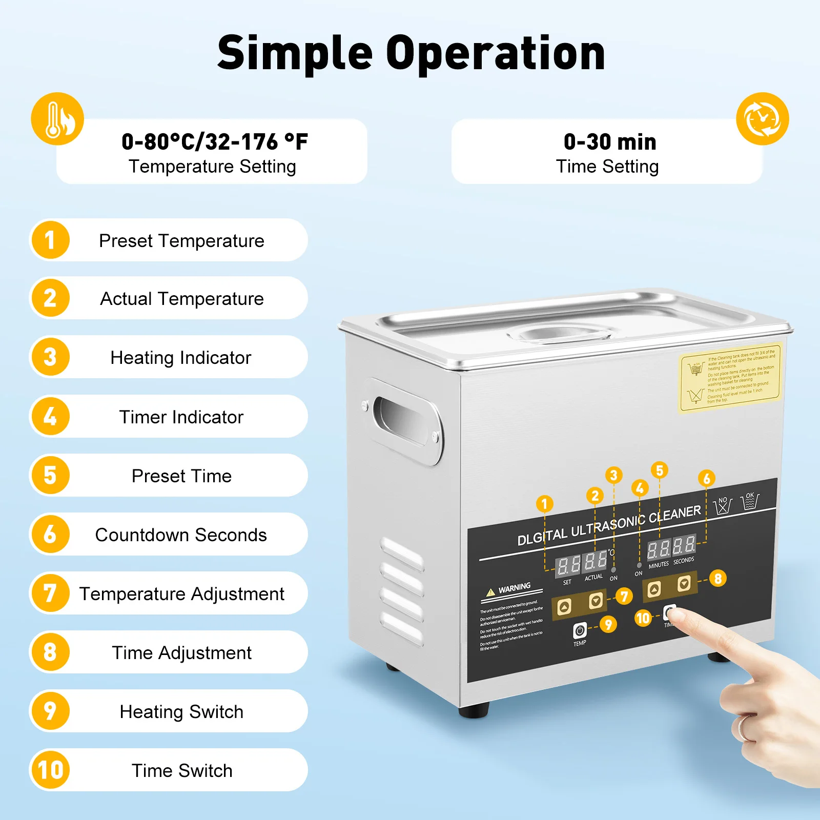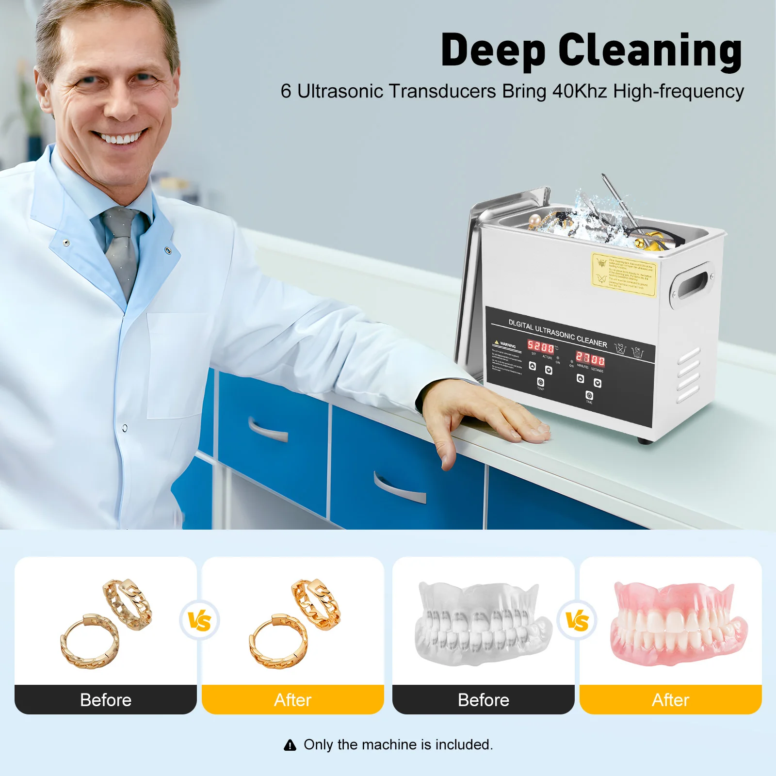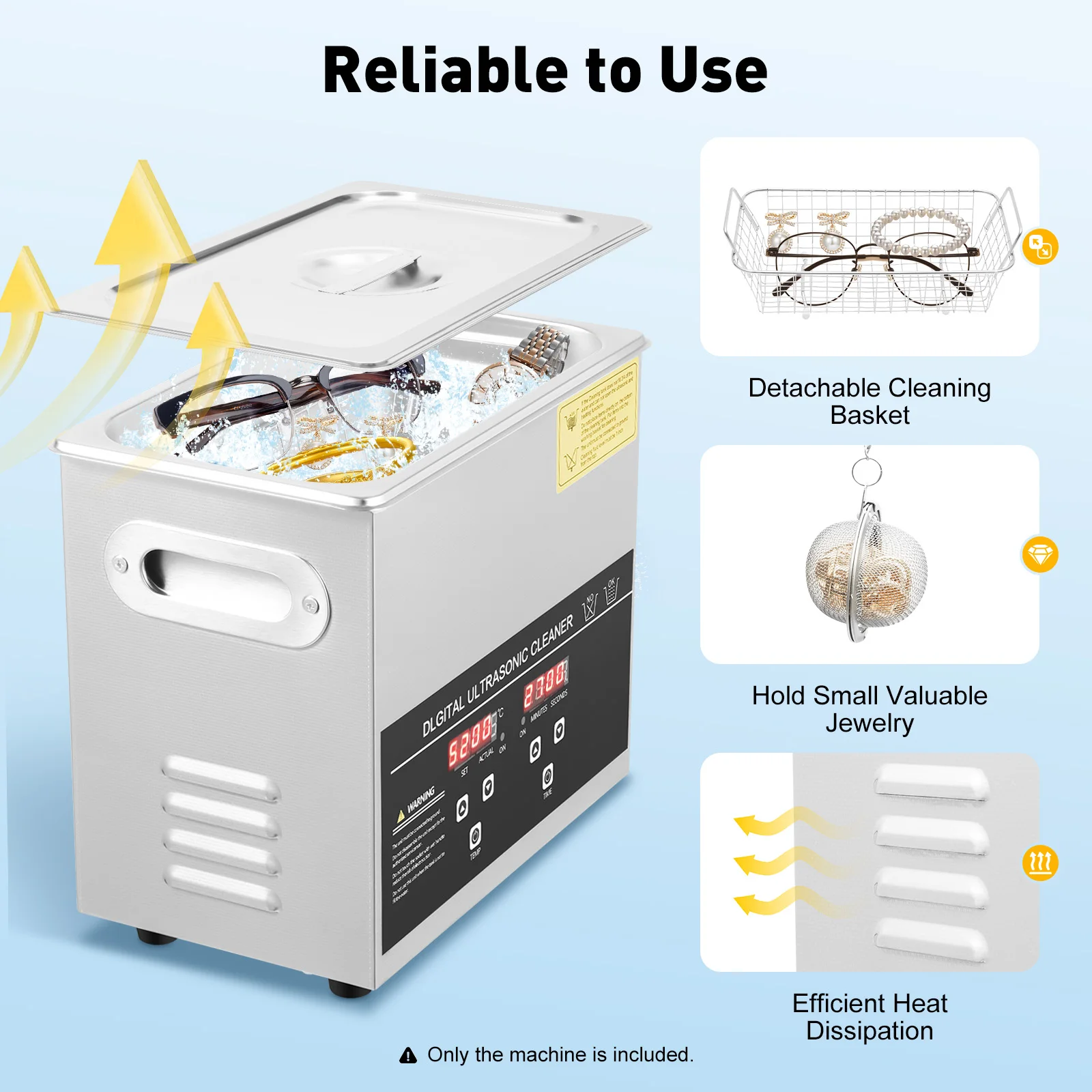 Powerful Cleaning Effect: 40KHz ultrasonic frequency, 120W ultrasonic power, and high heating power (100W) can remove the dirt on the surface of the object, effectively cleaning your valuables without any damage.