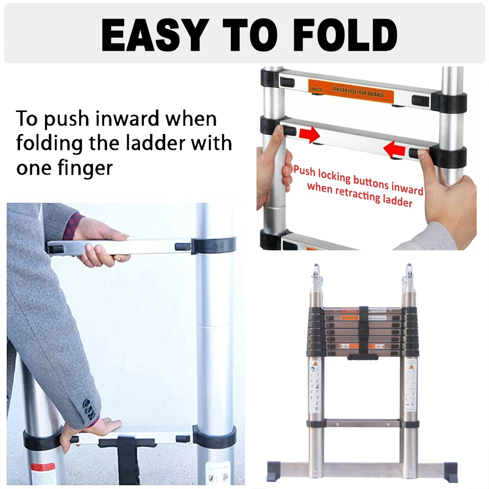 1. Safe and non-slip: Each section of the telescopic ladder is designed to be opened and closed safely without injuring your fingers. The non-slip rubber feet keep you firmly in place while you work, increasing overall safety