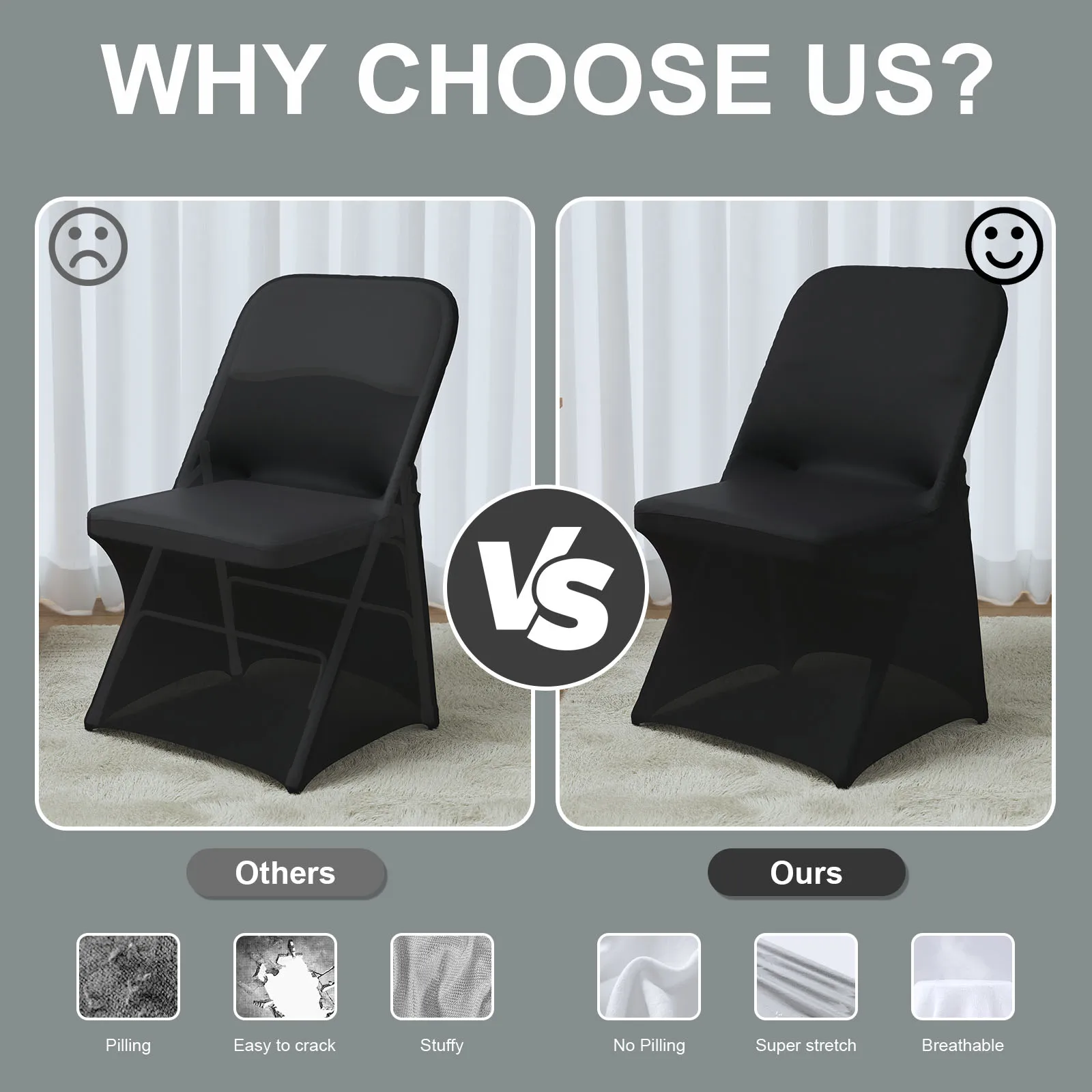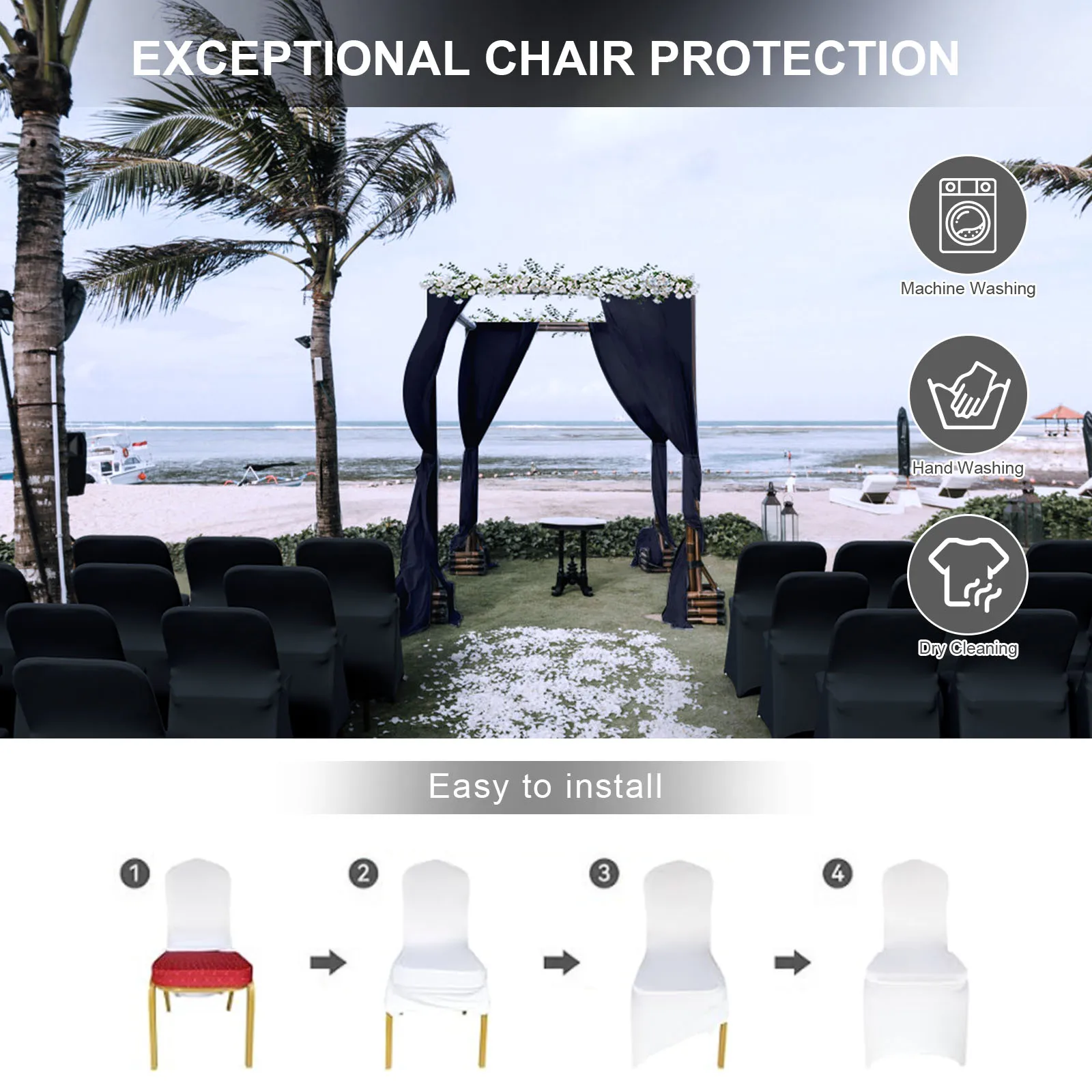 EASY TO INSTALL: Just a few steps, you can get a right look and feel, easy to install and disassemble. Our stretchable chair covers are machine washable, easy to clean and maintain. We are committed to providing you with high-quality folding chair covers and friendly service to ensure your 100% satisfaction