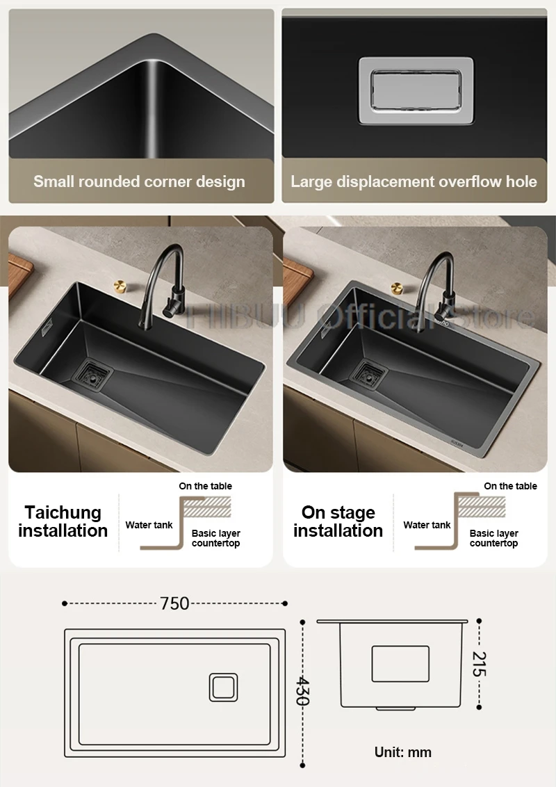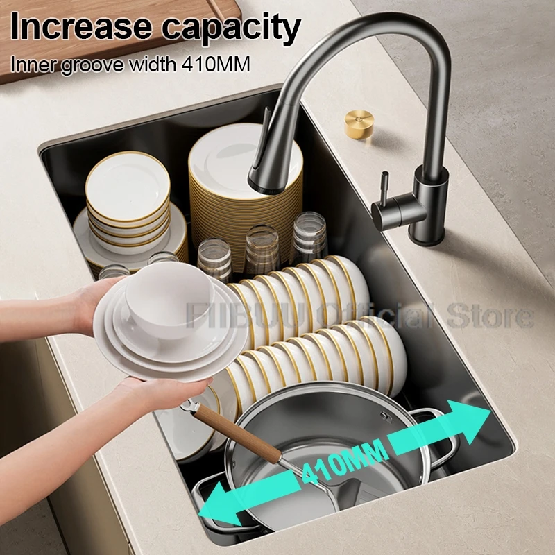 【Large capacity】 Boasting a depth of 215mm and an inner groove width of 410mm, this sink provides abundant space to hold a large volume of water and dishes. This significantly facilitates cleaning tasks.