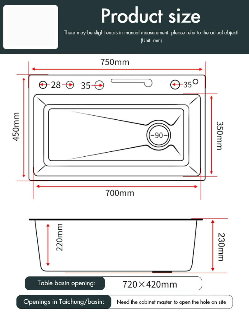 The sink size : 75X45CM/60X45CM Two option, Â “75×45 A Grey’ option is same with the Main Image,Warehouse send parcel according to the option you choose.