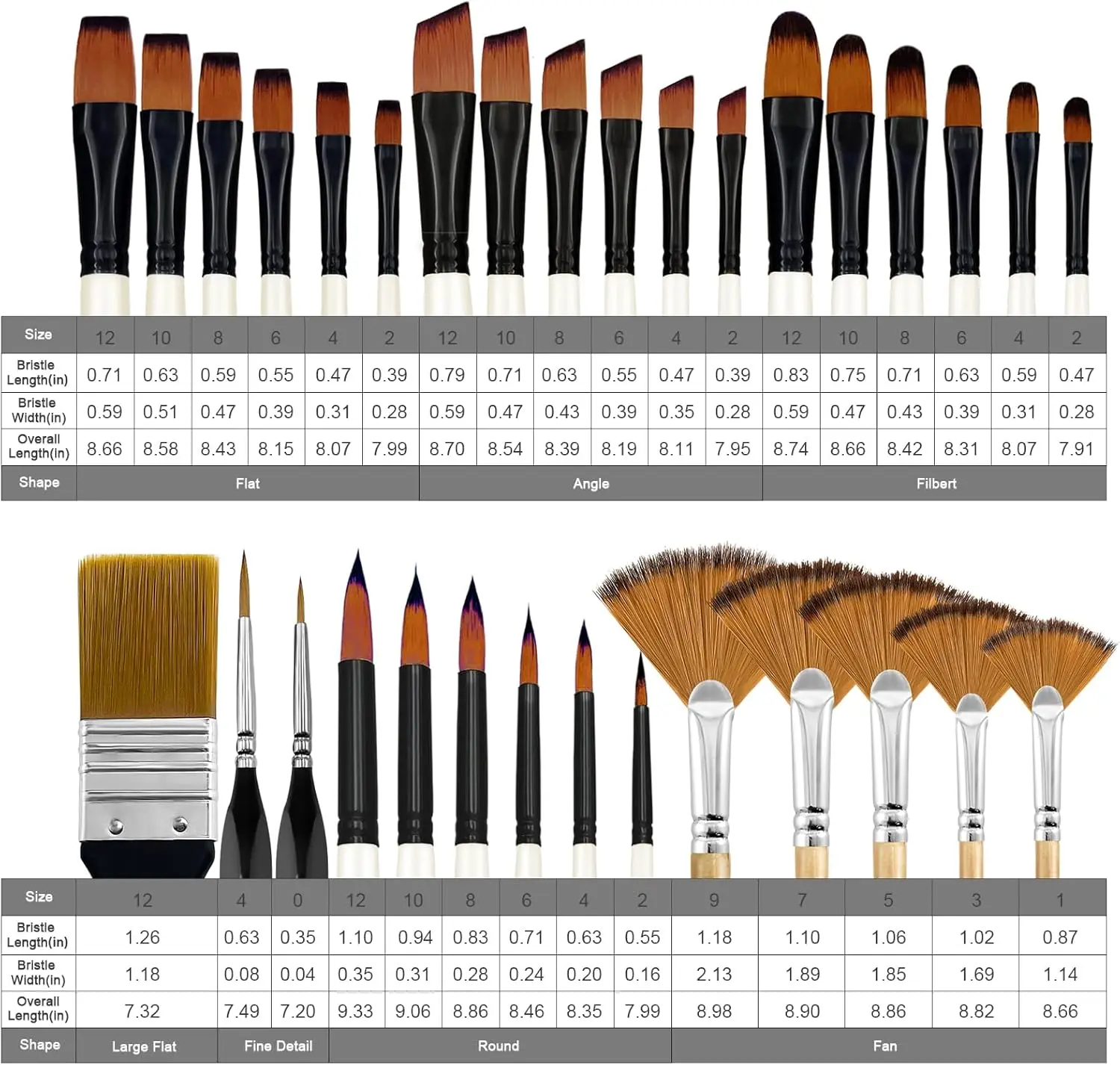 🎨32 Pieces Paint Brushes – Paint brushes for acrylic painting set includes 32 art paint brushes in 7 series. Whether it's for extreme details or large areas, these round, filbert paint brush, fan paint brush and flat brushes work well. The acrylic paint brushes include flat (2/4/6/8/10/12), Filbert (2/4/6/8/10/12), fan (1/3/5/7/9), round (2/4/6/8/10/12), angle round (2/4/6/8/10/12), detail (0/4), and large flat brush (2").