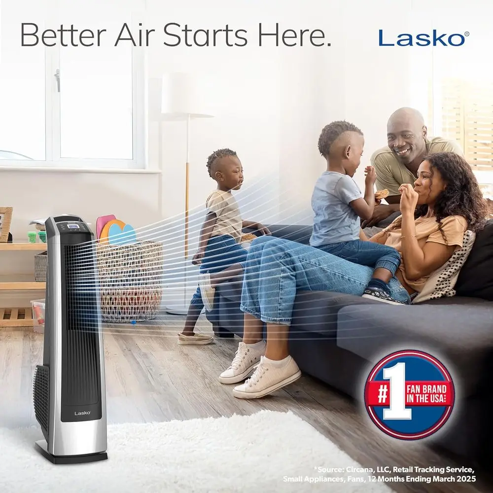 Experience enhanced airflow with 25% more air velocity than traditional room fans. This sleek tower design fan offers powerful cooling with a modern aesthetic.