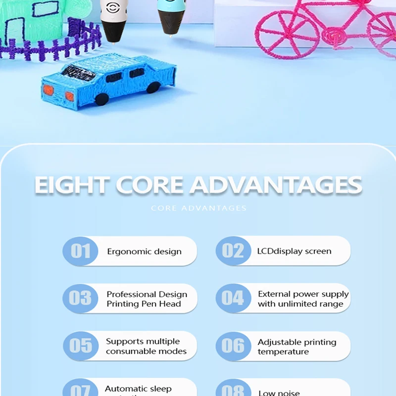 2: In order to make your 3D printing pen last longer, please press the exit button to exit the PLA from 3D pen after use, so as not to block the pen head and affect the next use.