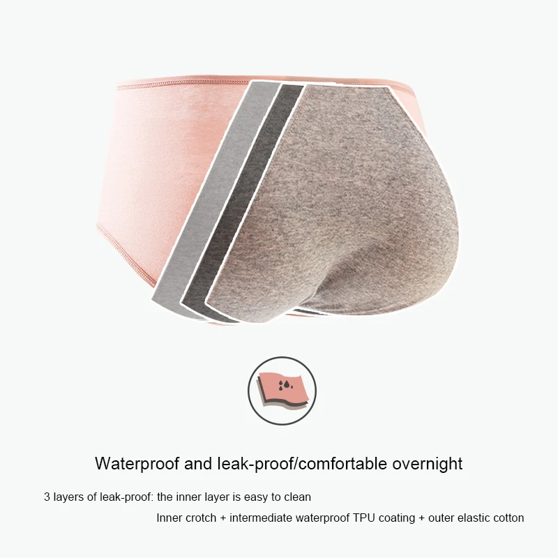 3 layers of anti-leakage: the inner layer is easy to clean; the inner crotch + the middle waterproof TPU coating + the outer layer of elastic cotton