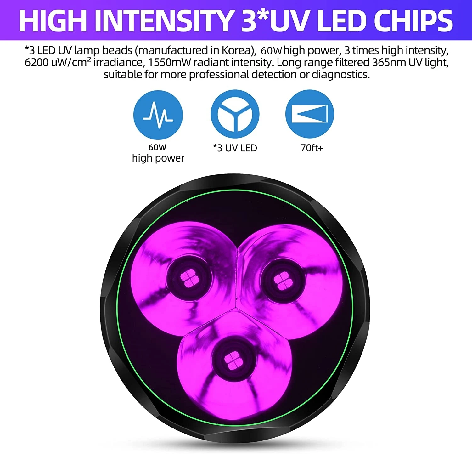 The Ultraviolet flashlight can be used as pet (dog/cat) urine detector/scorpion finder/fluorescent/detector/currency/license/card/ passport authenticating/oil stains/leakage detector/ore/antique identification/UV glue curing/ect.