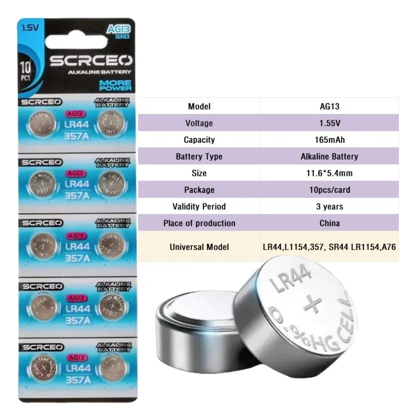 Compatible Models: A76, A76-1,1166, 1166A, 1107SO, 1131SO, 157, 303, 357, 357A, 675, 76A, CA18, CA19, CX44, D357/303,G13,G13A,GP76A,GPA76,GP357,L1154,LR1154,LR44,LR44H,PX76,PX76A,RW82,S76,SR44,SR44W,SR1154,SP357,V357,V13GA.
