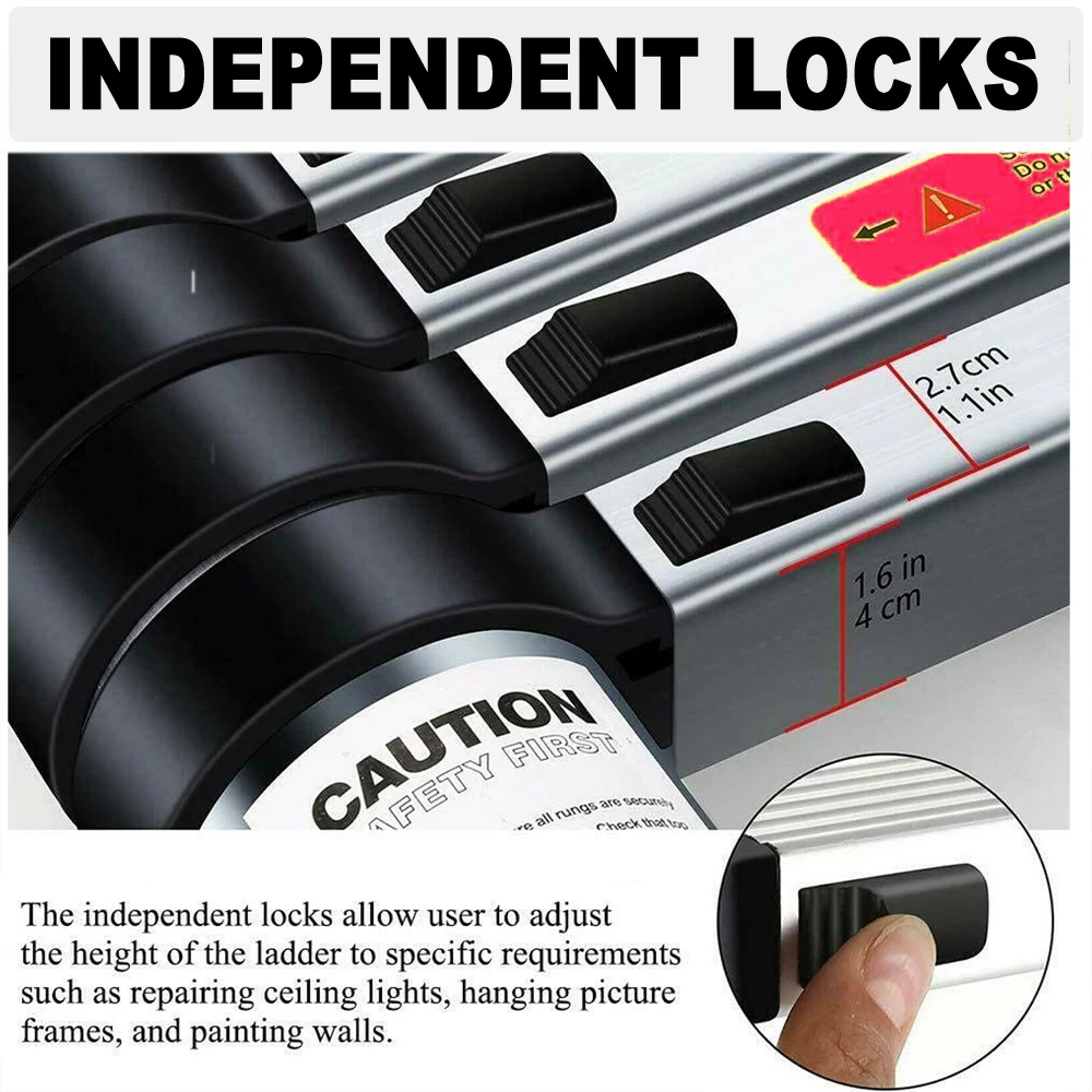 1. Safe and non-slip: Each section of the telescopic ladder is designed to be opened and closed safely without injuring your fingers. The non-slip rubber feet keep you firmly in place while you work, increasing overall safety