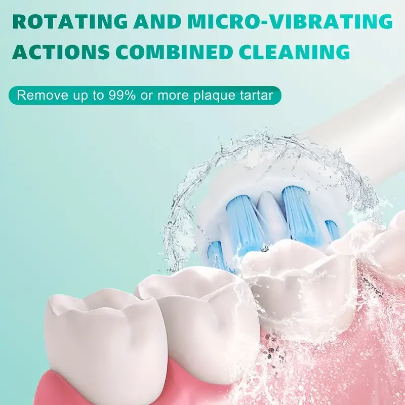 Efficient cleaning: The dense bristles thoroughly remove plaque from the tooth surface and also remove plaque stuck between the teeth. The rounded brush head wraps around each tooth and fully utilises the rotating toothbrush to completely remove plaque