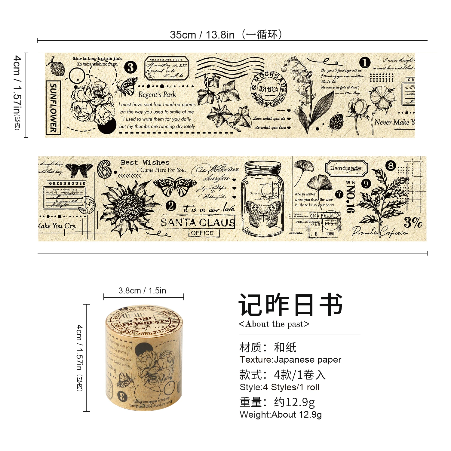 4-roll set – vintage washi tape – 2 rolls 1.38in×78.7in + 2 rolls 1.57in×78.7in – decorative paper tape for scrapbooking, journaling, crafting, and gift wrapping – assorted elegant designs for diy projects and art supplies