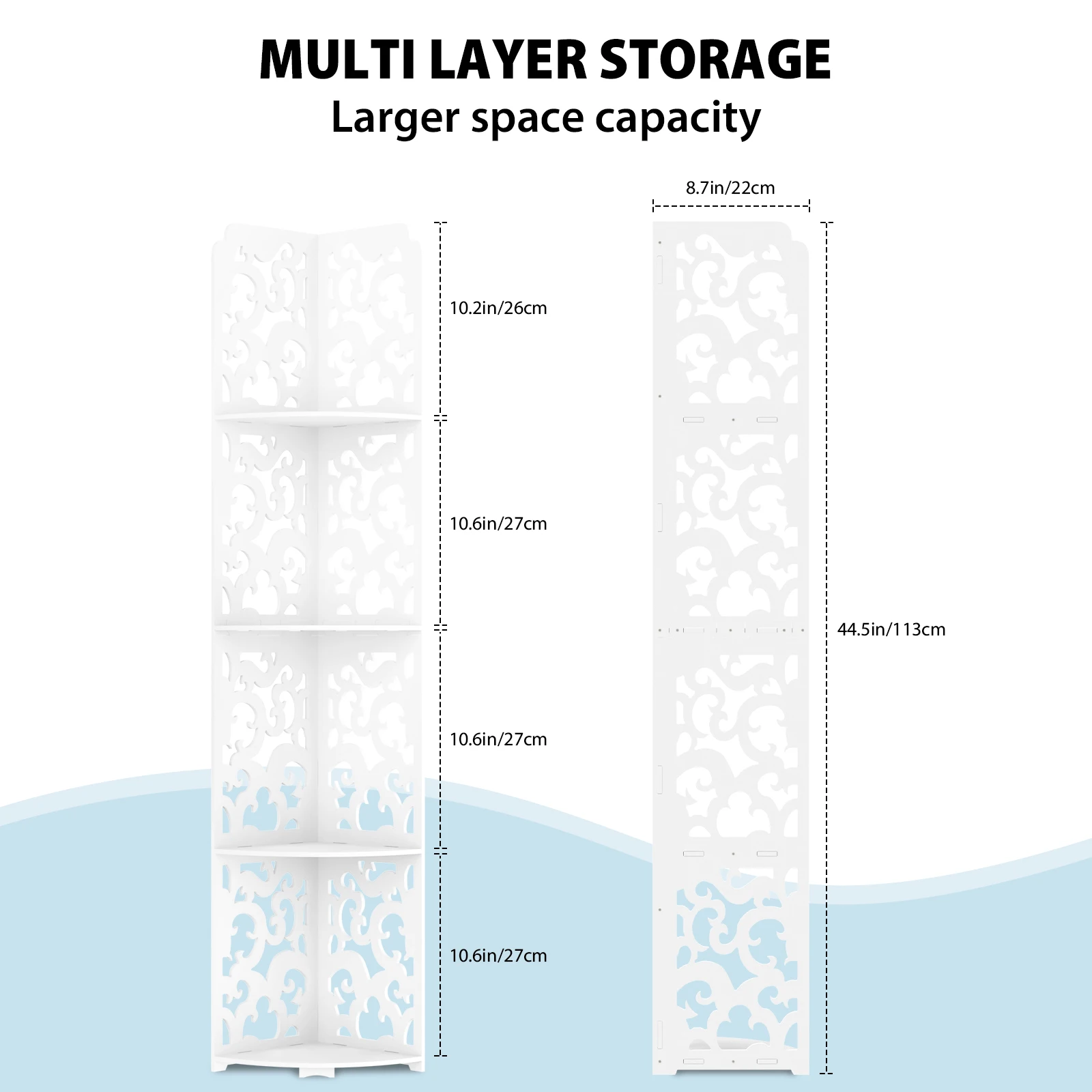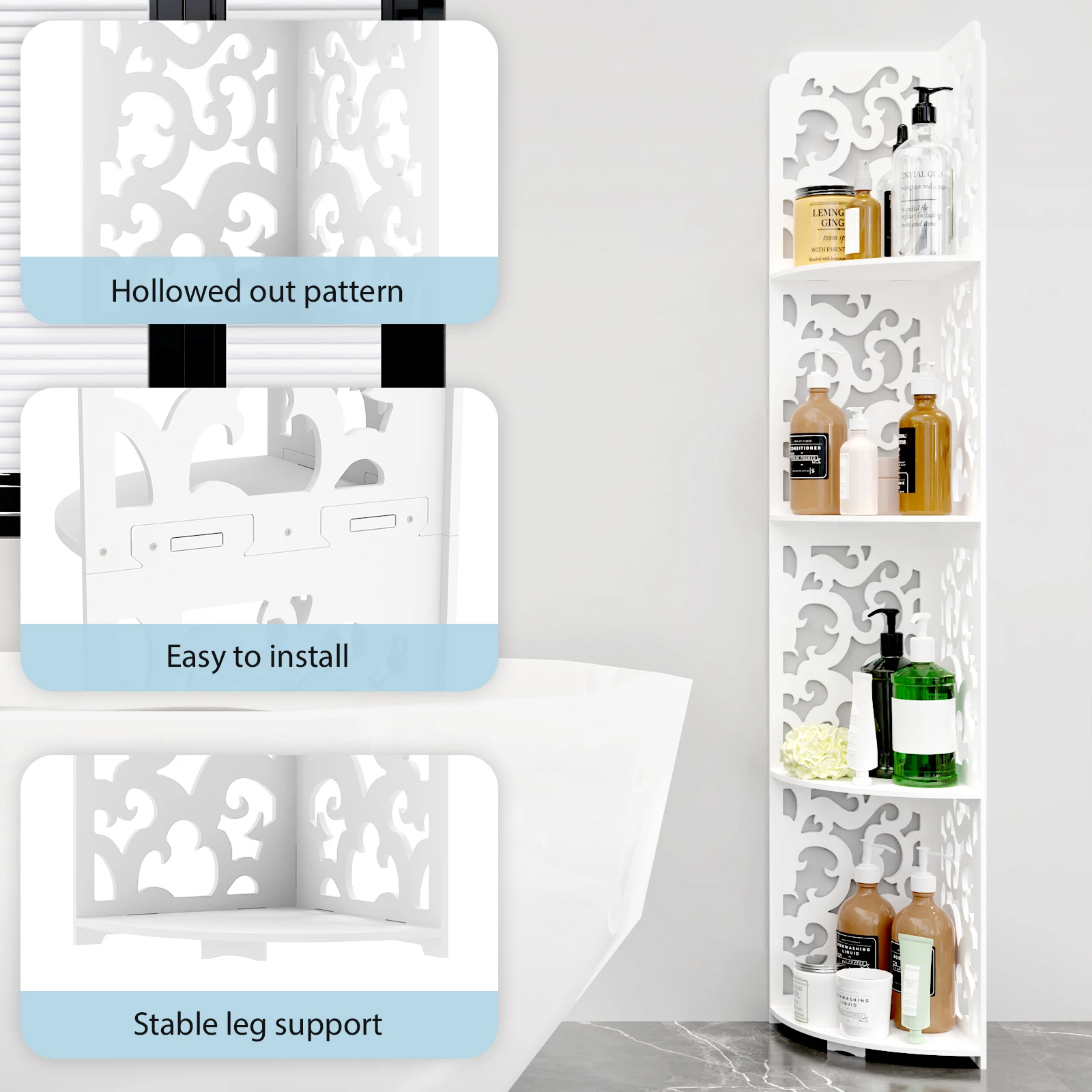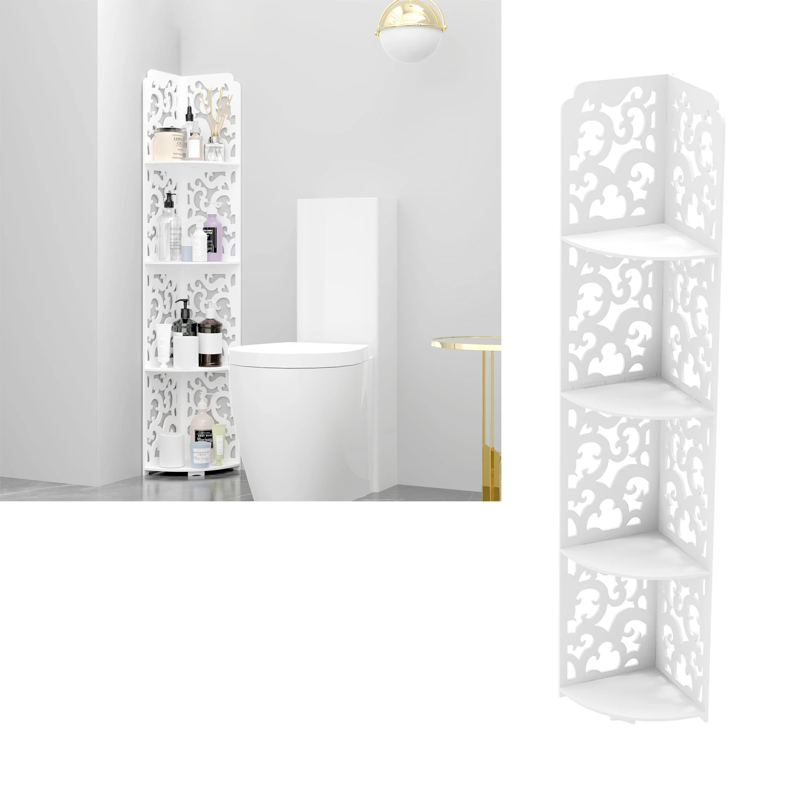 4 Tier Corner Shelf: The 4 tier corner organizer shelf is made in 100% high grade PVC material. Which is lightweight and portable.