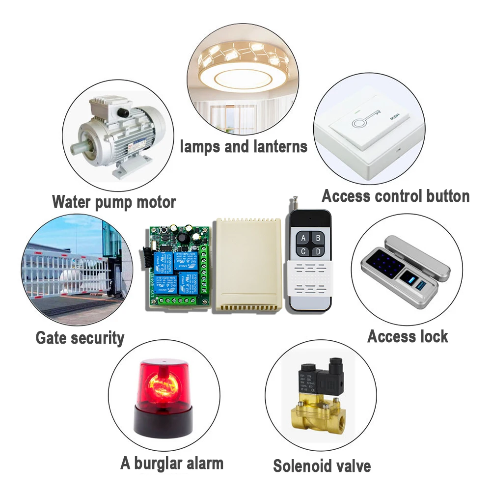 Products can be used in homes, farms, factories, offices, laboratories, supermarkets and so on.You can remotely operate every device connect with the relay receiver through the remote control. such as, garage door, electric door, shutter door, expansion door and electric curtain, fan, Lamp, lighting, ventilation device, Signal transmission and so on.