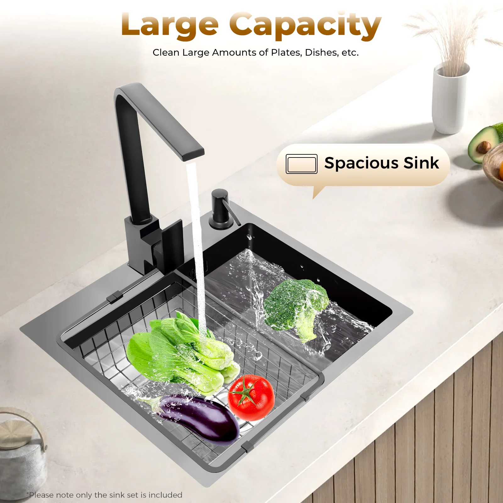 Large Capacity: The spacious sink (16.14*12.01 in) allows you to clean large amounts of plates, dishes, and pots, and wash fruits, and vegetables at one time without splashing, saving time.