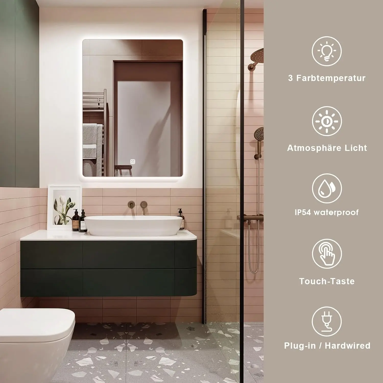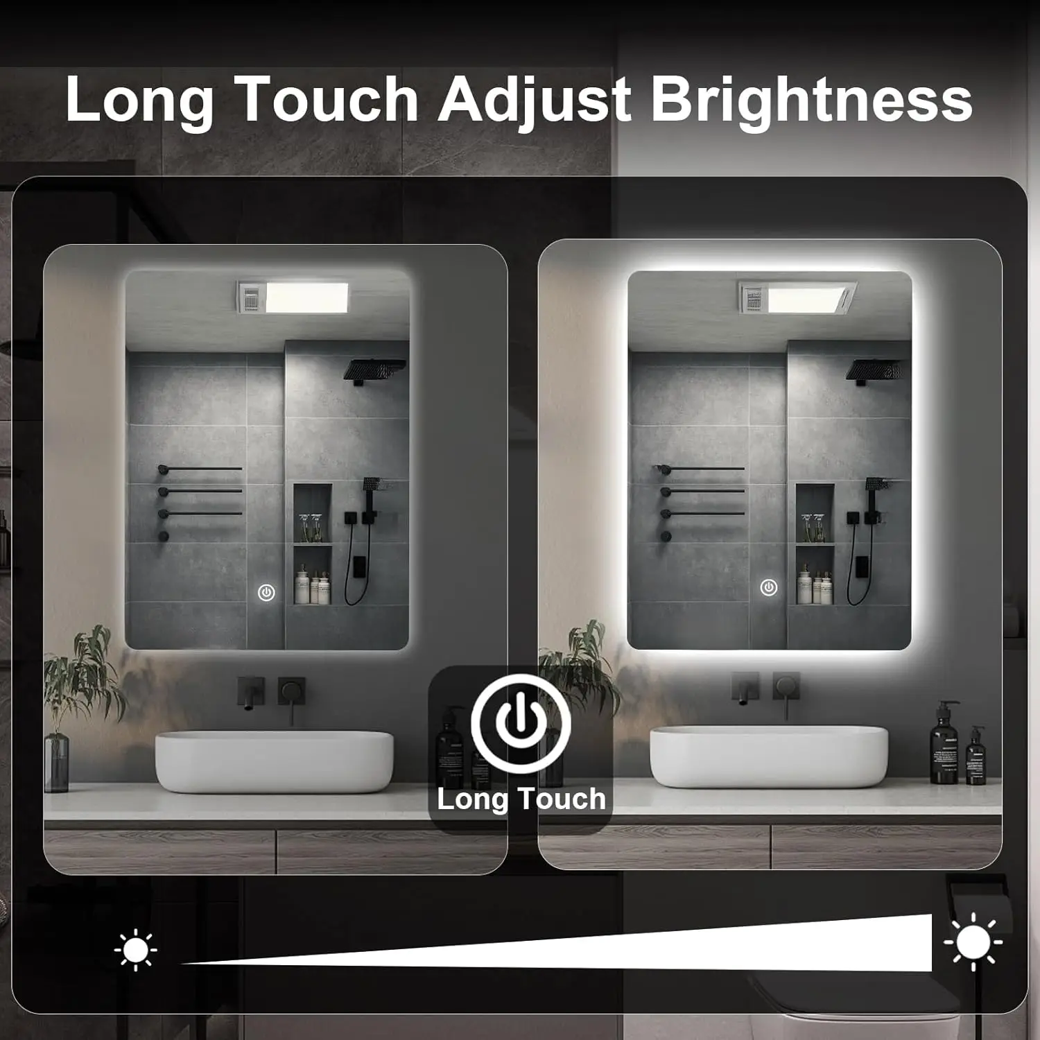Dimmable and 3 colors: The brightness of this LED bathroom mirror can be adjusted. Briefly press the light button to change color (3000K warm, 4000K natural, 6000K). Long press to adjust the brightness from 10% to 100%