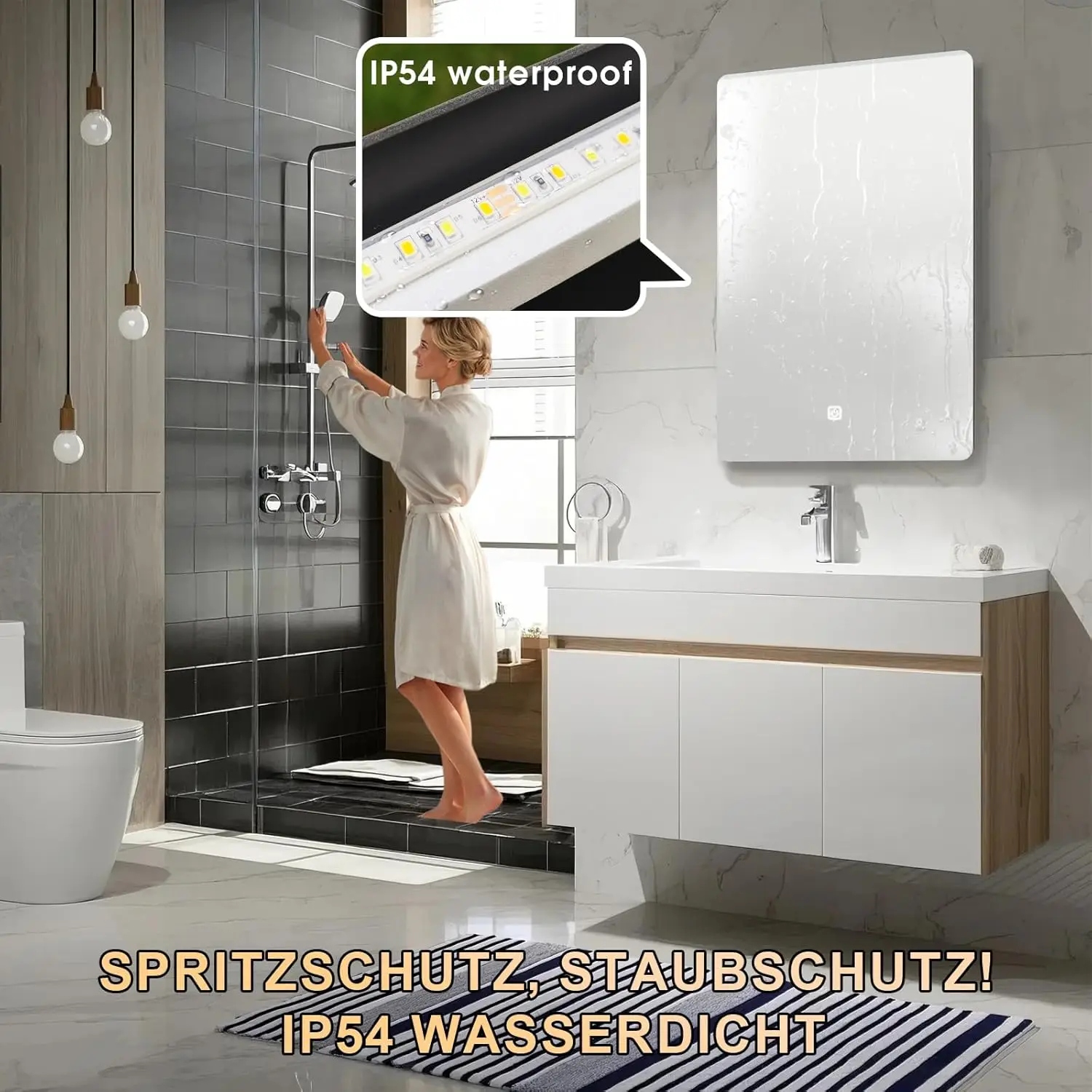 IP54 waterproof: The light tires of our bathroom mirror is covered with a rubber pipe, sealed and waterproof, which can effectively resist splashing water drops and moisture.