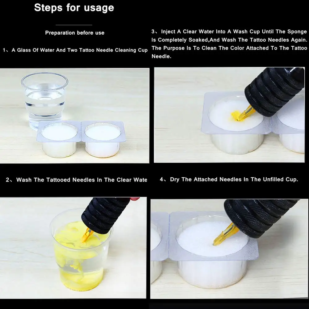 3. Inject A clear water into A wash cup until the sponge is completed soaked, and wash the tattoo needle again. The purpose is to clean the color attached to the tattoo needles.