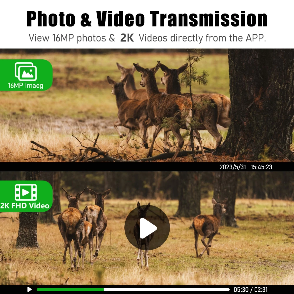 0.2s trigger speed enables you to capture animal movements at lightning speed. Fully keep track of all memorable moments. Monitoring wildlife cameras support 2K HD videos. It has a maximum detection range of 15 meters and 95° wide angle allows you to caputure both everything in front of the deer camera with high quality details.