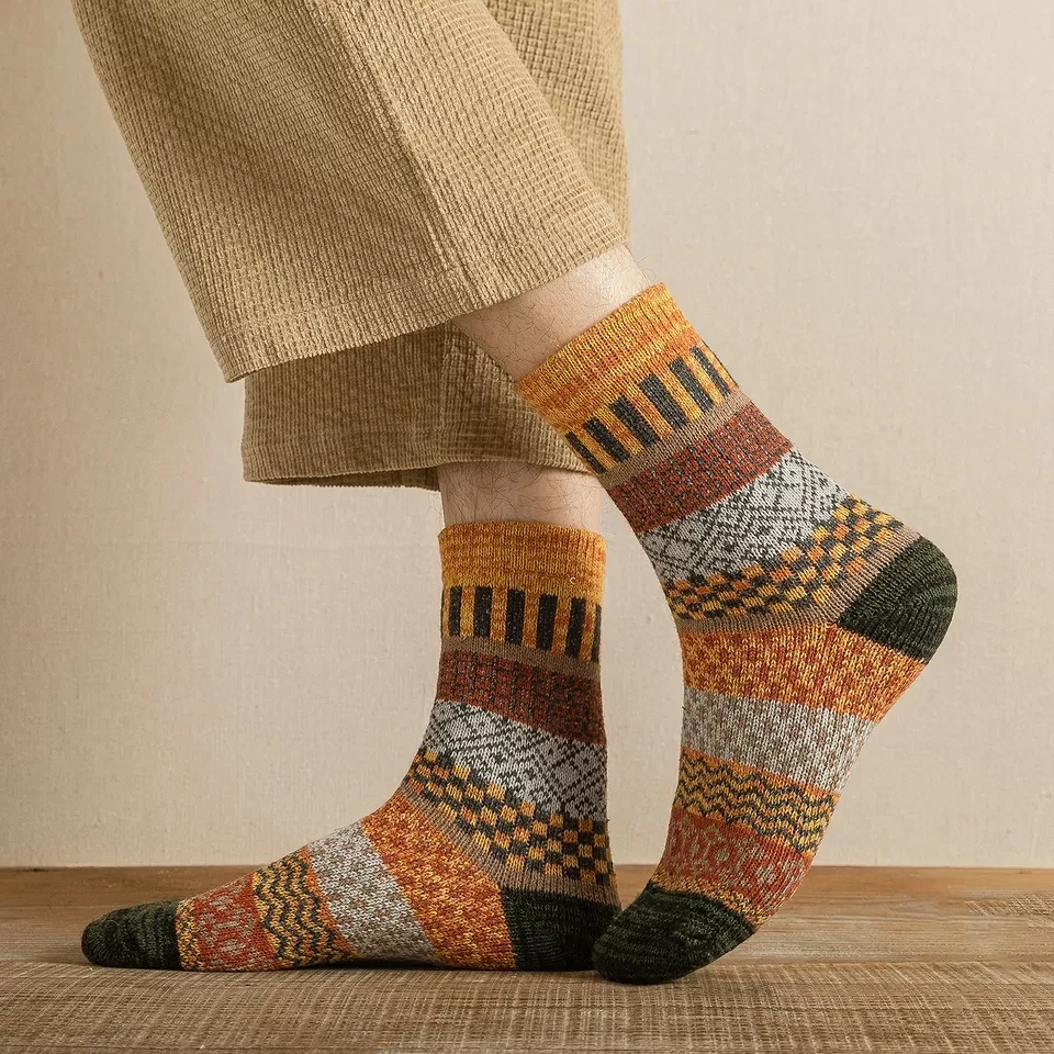 The socks are synthetic, but OK!!! Beautiful!!! They fit my husband’s size 41 and are higher than others. Thick, but not too much!!!! Thank you!!!