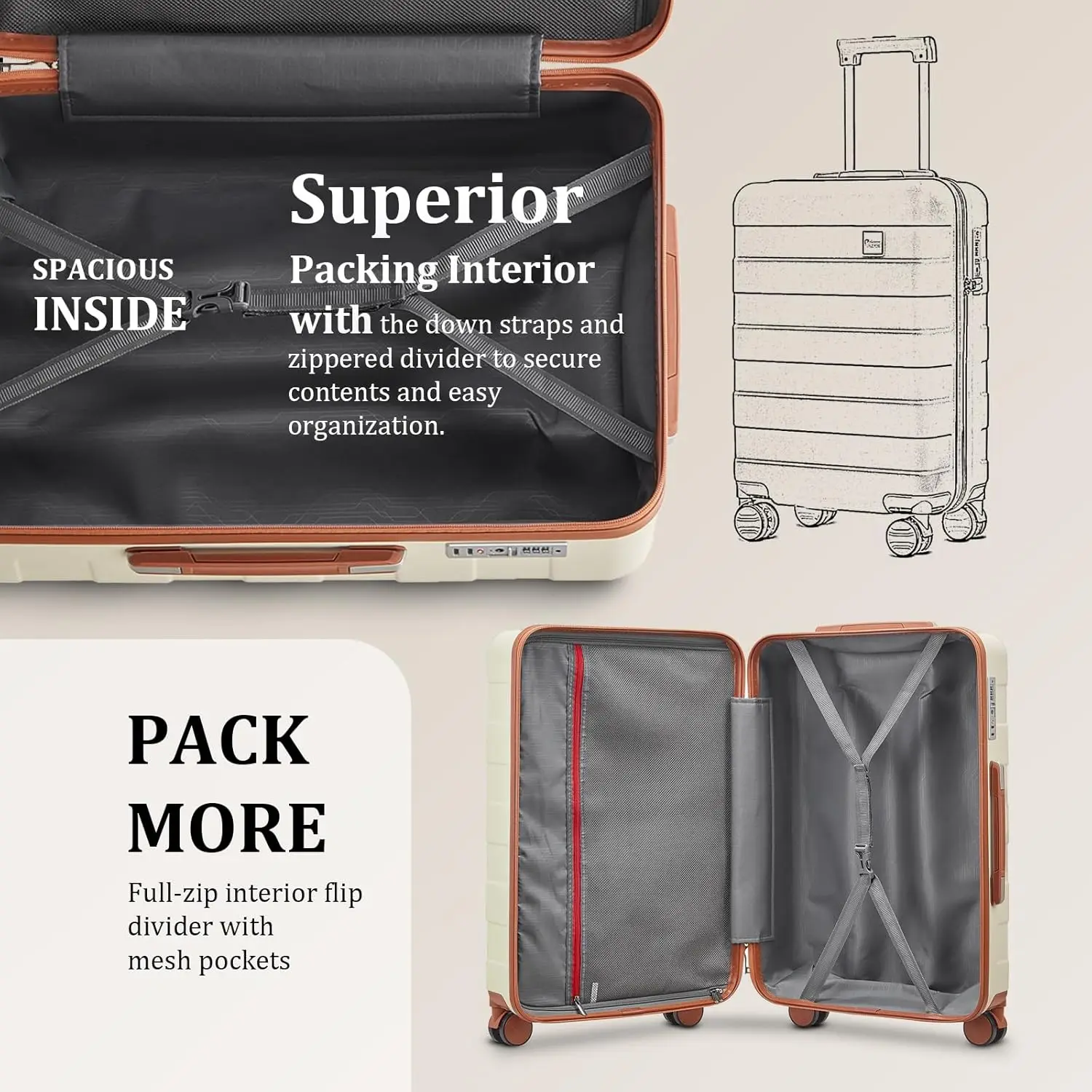 1. Premium 5-Piece Luggage Collection: This comprehensive set includes three durable hardside rolling suitcases, one spacious travel bag, and one convenient toiletry bag. Designed for women seeking both style and functionality, it offers everything needed for organized travel. 2. Effortless Mobility with Spinner Wheels: Experience smooth and silent 360-degree rotation thanks to the high-quality double spinner wheels. Maneuver through airports, hotels, and streets with ease, making your journeys more comfortable and less strenuous. 3. Expandable Storage for Maximum Capacity: The rolling luggage features an expandable design that provides extra space when needed. With a sleek beige exterior and complementary zippers, this set combines elegance with practicality, ideal for various travel occasions from business trips to vacations. 4. Enhanced Security with TSA-Approved Lock: Each suitcase is equipped with a TSA-accepted lock, ensuring your belongings remain secure during transit. This feature allows airport security to inspect without damaging the lock, offering peace of mind whether you’re checking bags or carrying on. 5. Durable Construction and Lightweight Design: Crafted from robust hard shell materials, these suitcases withstand the rigors of travel while remaining lightweight to avoid excess baggage fees. The sturdy handles and reinforced corners add durability for long-term use. 6. Versatile Travel Companion: Suitable for solo travelers or families, this set accommodates different packing needs. The included travel bag is perfect for short trips or as an extra carry-on, while the toiletry bag keeps essentials organized and accessible. 7. Customer Support Commitment: We provide reliable 24-hour customer service to address any inquiries or concerns promptly. Our team is dedicated to ensuring your satisfaction with every purchase, backed by responsive assistance within 24 hours.