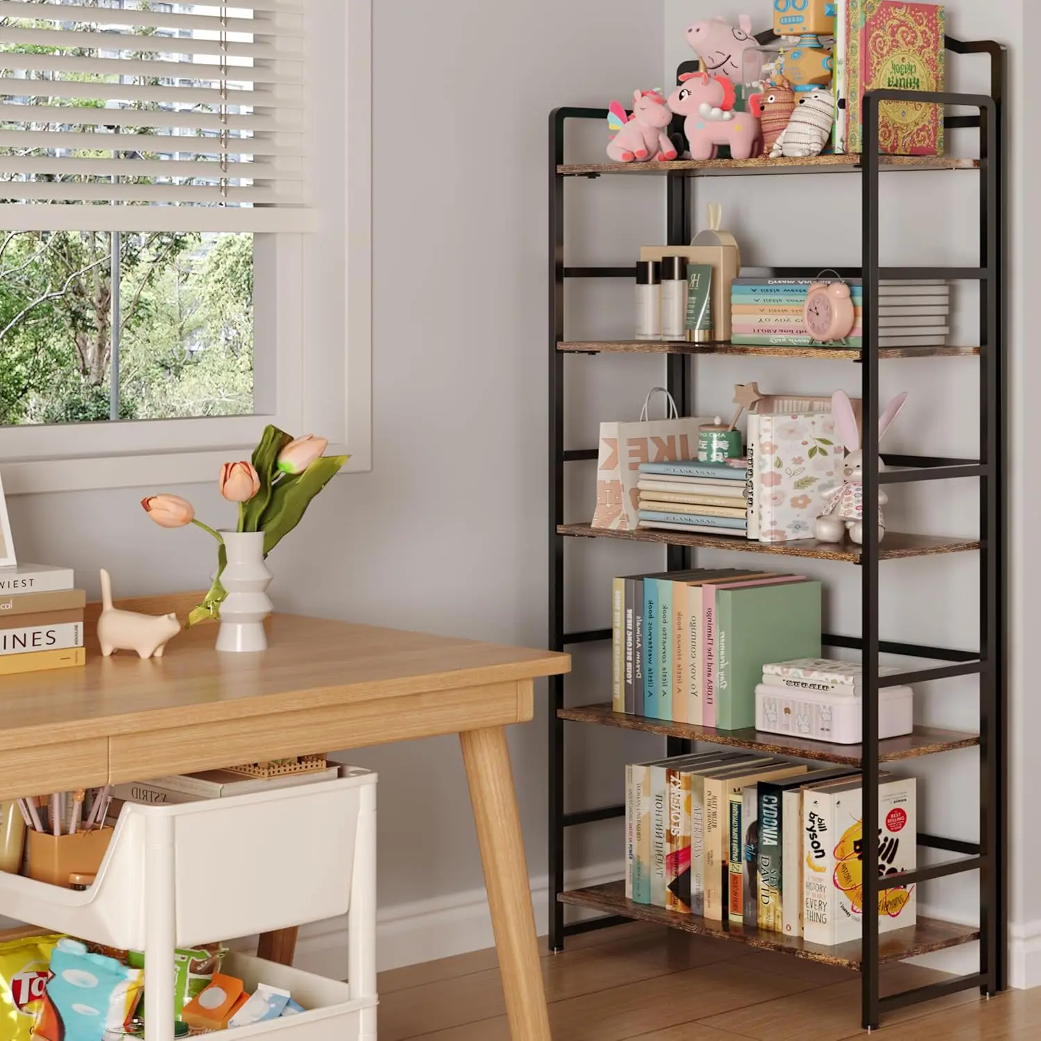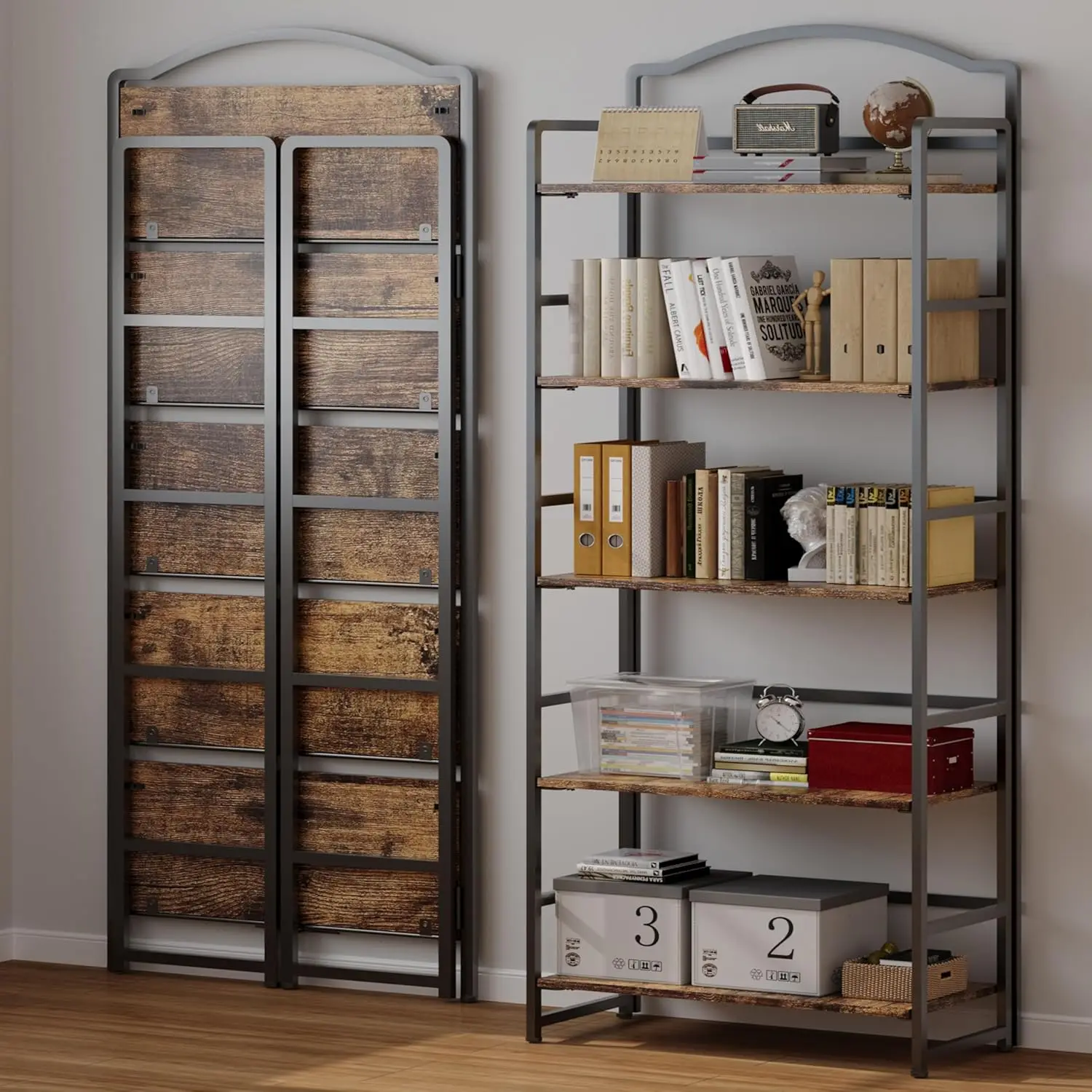 Transform your space with our versatile and stylish folding bookshelf. This product is designed to meet your storage needs while adding a touch of vintage charm to any room. Key Features: – **Easy Assembly**: No tools required! Simply unfold and set up in minutes, saving you time and effort. – **5-Tier Design**: Offers ample storage space for books, decor items, office supplies, or personal belongings, keeping everything organized and within reach. – **Vintage Wood Finish**: Crafted with a classic wood look that complements various interior styles from modern to rustic, enhancing the aesthetic appeal of your home or office. – **Foldable & Portable**: Lightweight and foldable design allows for easy storage when not in use or convenient transport between rooms or locations. – **Durable Construction**: Made from sturdy materials to ensure stability and long-lasting use, supporting heavy items without wobbling. – **Multi-Functional Use**: Perfect for living rooms as a decorative shelf, bedrooms for extra storage, offices for organizing documents, or even as a display unit in retail spaces. Benefits: – Save space with its compact folding feature when not needed. – Enhance organization by categorizing items on different tiers for quick access. – Add character to your decor with the timeless vintage style that blends seamlessly with existing furniture. Ideal For: – Homeowners looking to declutter and beautify their living areas. – Students needing an efficient study setup in dorm rooms or apartments. – Professionals seeking a tidy workspace in home offices or corporate environments. This bookshelf combines practicality with elegance, making it a smart choice for anyone seeking functional storage solutions. Upgrade your organization today!