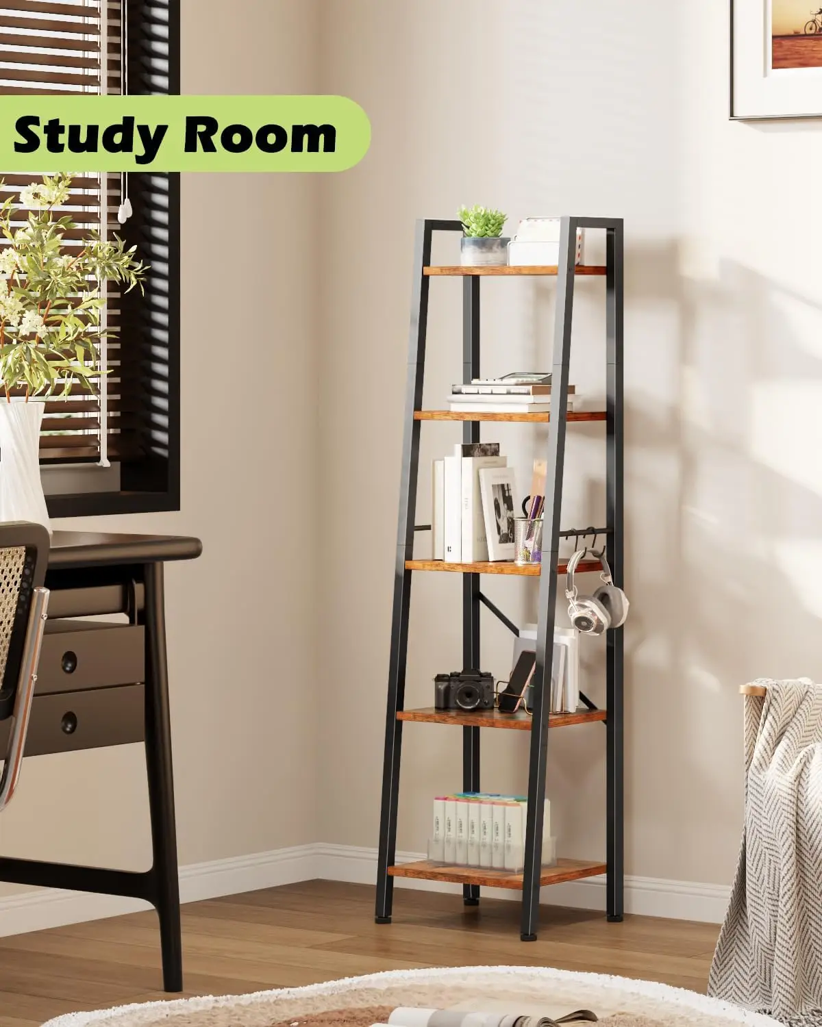[Space-Saving Design] This tall narrow bookshelf occupies only 12.9″D * 11.4″W of floor space with 5 tiers of vertical storage, making it ideal for maximizing tight spaces in any room. [Versatile Storage Solution] Featuring a rustic brown finish with black steel frames, this industrial-style shelf can be used as a study office bookshelf, living room vertical bookshelf, kitchen storage shelves, display shelves, or plant shelves to enhance spaces like living rooms, offices, bedrooms, bathrooms, and balconies. [Multiple Size Options] Choose from 3 sizes: 4 tier, 5 tier (this model), and 6 tier to suit your needs. The vintage style easily matches any furniture decor. Includes 2 hooks for hanging keys, bags, headphones, or other small items to add functionality without monotony. [Sturdy and Stable Construction] Designed with a sturdy frame featuring an X-backboard for added support. Equipped with 4 adjustable feet and an anti-tip kit to ensure durability and stability on various surfaces. [Easy Assembly Process] Comes with all necessary assembly tools and a clear instruction manual. Each accessory is numbered to correspond with the manual steps for straightforward assembly that can be completed quickly by following the instructions step-by-step. [Reliable Customer Support] Our dedicated after-sales team is available to assist with any product-related issues. If you encounter problems after receiving your item, please contact us directly—we are committed to resolving concerns promptly and effectively. Product Dimensions: Depth: 12.9 inches; Width: 11.4 inches; Height: Approximately 53.15 inches.