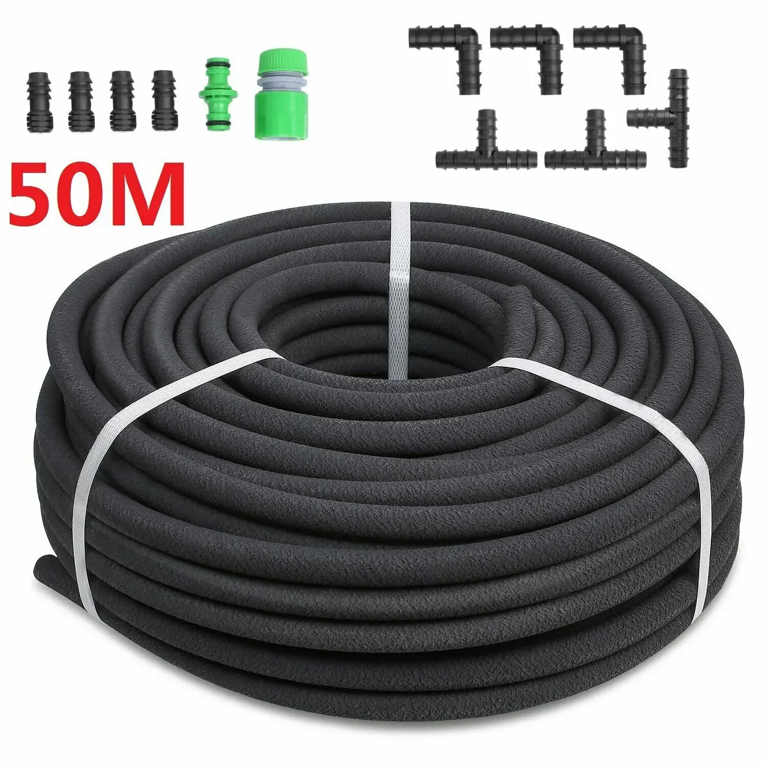 【Adaptable and flexible】The soaker hose set is equipped with 50m 1/2 inch diameter irrrigation hose and accessories(1 x 1/2 inch quick hose piece, 1 x double clutch, 3 x corner connectors, 3 x T-connector, 4 x end plugs), it can be cut or extended to the length according to your need. It will be easy to be installed in different sizes of garden or complicated terrain.