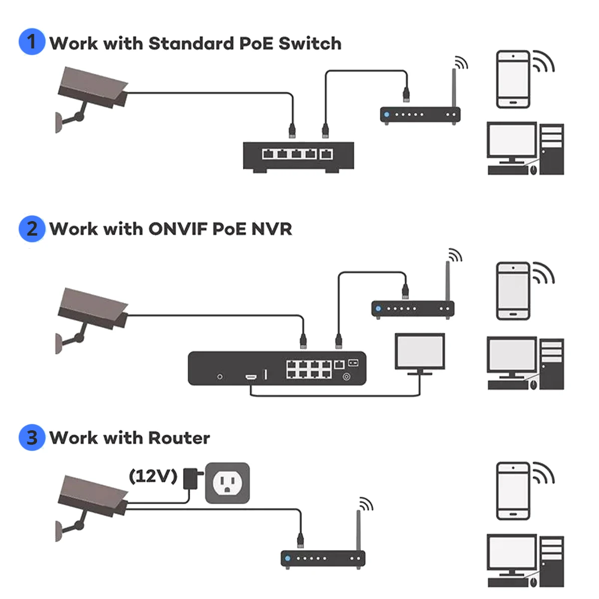 Power over Ethernet means the IP cameras connect to with a single cable that transmits both data and power. No power adapter is required, lower risk of electric leakage and easy to set up.