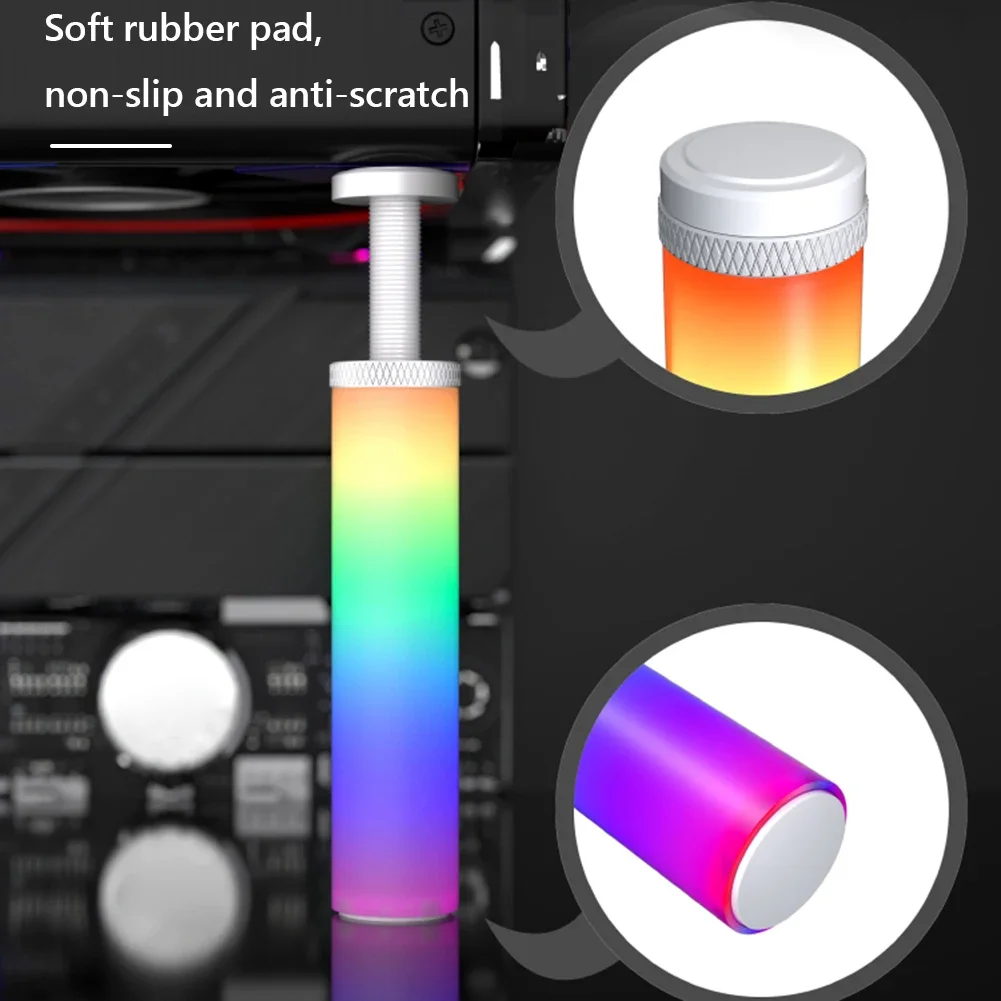 Feature: 1. Adjustable Spiral Design for Enhanced Compatibility: The graphics card GPU holder support boasts an adjustable spiral design, allowing for easy height adjustment and locking of the support rod. This user-friendly feature ensures compatibility with various case specifications, including compatible with ATX, M-ATX, and ITX, providing effective support for the tail of the graphics card and safeguarding its performance. 2. Aluminum Alloy Construction: Made from aluminum alloy, the video card bracket stand is designed for longevity and durability. Treated with CNC injection molding, its surface offers an exceptional texture that remains new over time. This construction provides stable support and protection for the graphics card, ensuring balanced stress distribution for smoother operation and more enjoyable gaming experiences. 3. ARGB Lighting Synchronization for Aesthetic Appeal: The graphics card holder incorporates a 5V 3-pin ARGB dual-interface design, significantly enhancing its expandability. It supports ARGB lighting sync interfaces from major motherboard brands like compatible with ASUS, MSI, Gigabyte, and ASRock, allowing for software-controlled, programmable 16.8 million color lighting effects. The vibrant, soft, and full colors add a cool aesthetic to your gaming setup. 4. Magnetic Design & Protective Pads for Secure Installation: Equipped with a strong magnet and silicone pad design, the graphics card GPU brace ensures a stable and secure attachment, facilitating convenient installation. It can adhere to iron materials like the power supply bay or the bottom panel of the case, providing stable support for your graphics card. The top surface is covered with a silicone pad to prevent scratches and displacement, offering intimate protection for the graphics card. 5. Detachable and Adjustable Structure for Support: The GPU support bracket features a detachable and adjustable design, supporting a wide range of height adjustments (from 70 to 125mm) with its external bracket, bracket cap, and internal bracket screw column. This allows for flexible support height customization, catering to different user needs and ensuring optimal support for the graphics card.