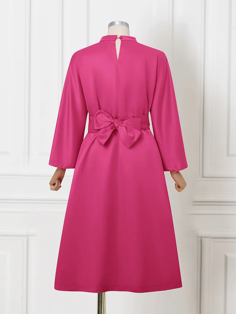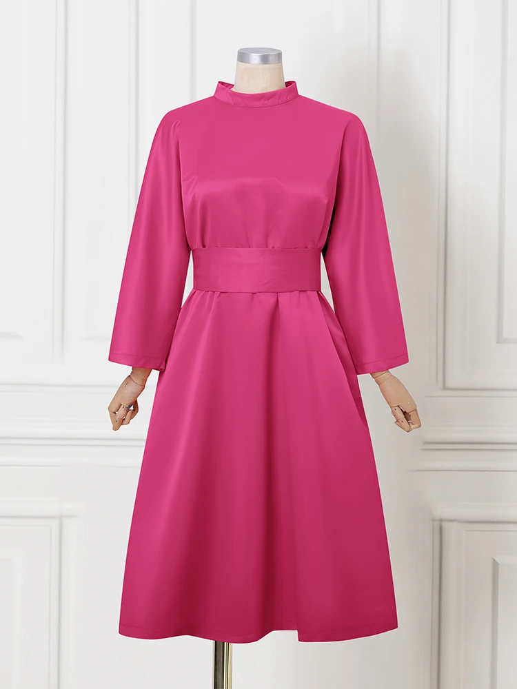 Features:A mid-length satin dress with a stand-up collar, belt