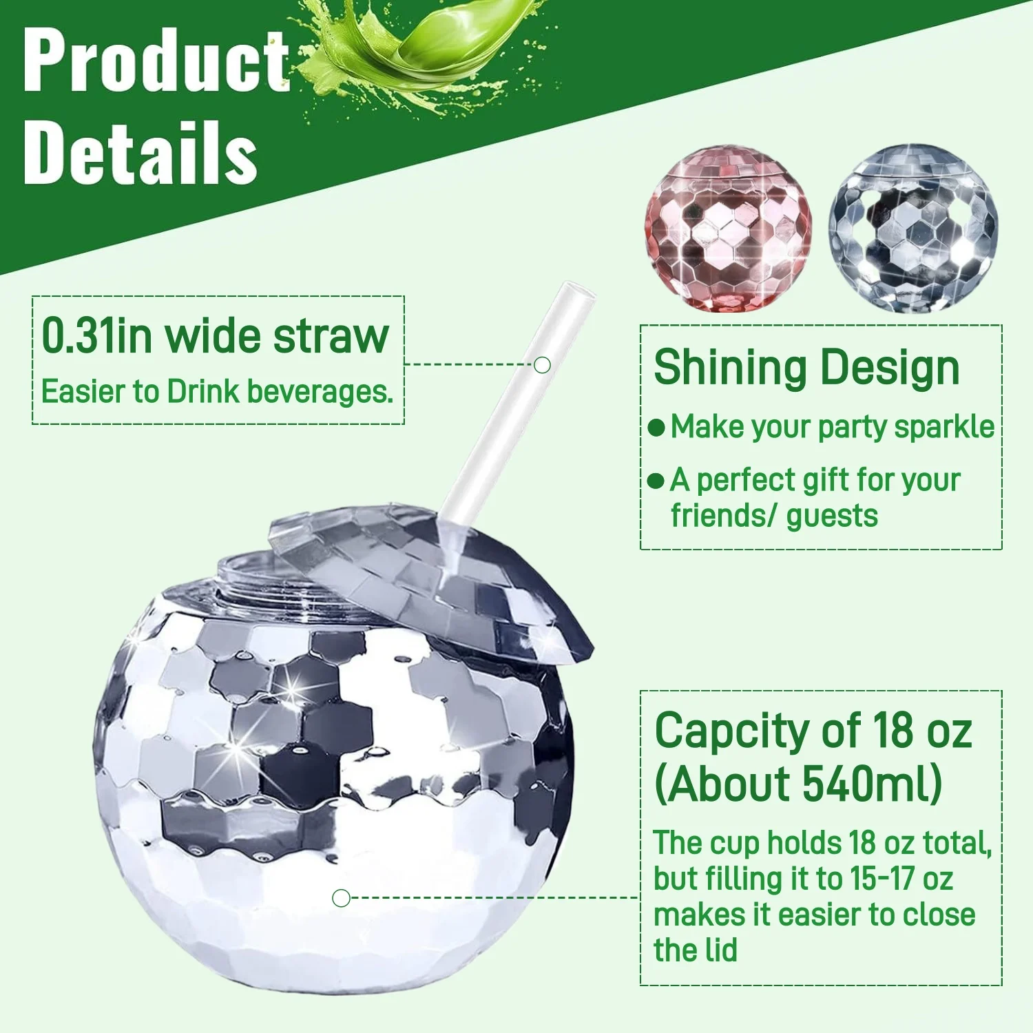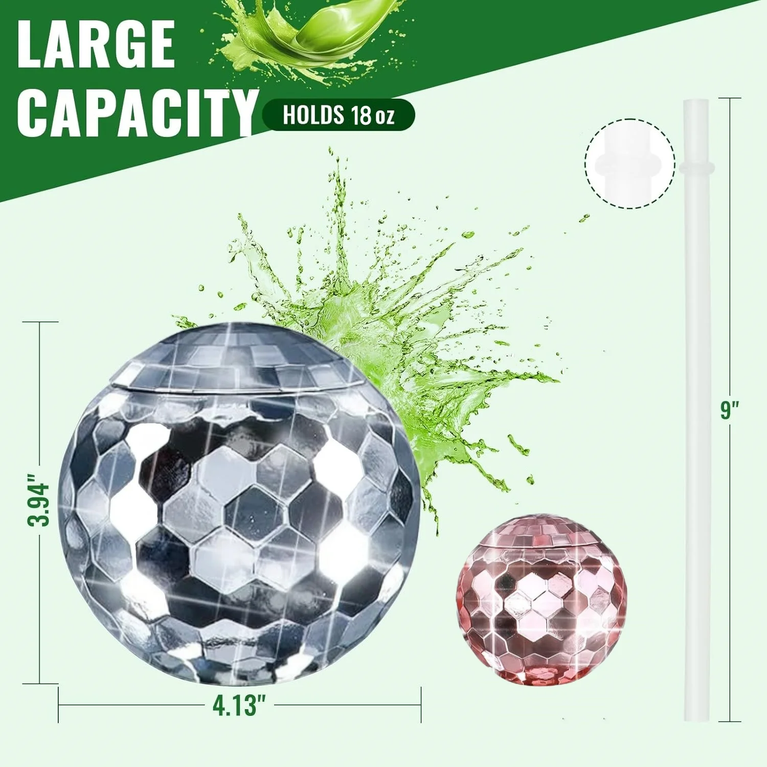 The capacity of the party cup is 18oz and its size is 4.13inx4.13in. The size of the straw is 9in. This mug can be used as a juice mug, cocktail mug, flower tea mug, etc.