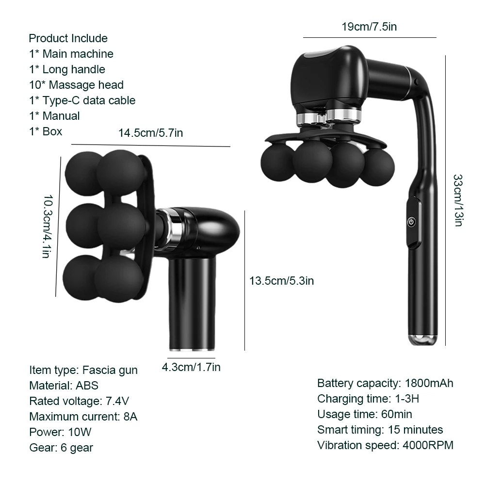 7.Wireless Use & Long battery life. Charge 1 time, can be used for a long time,15 minute intelligent stop, prevent excessive massage, protect fascia and muscles. Battery capacity 1800mAh, charging time 1-3 hours, using time 60 minutes.