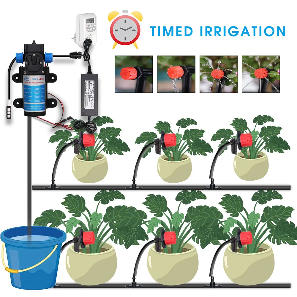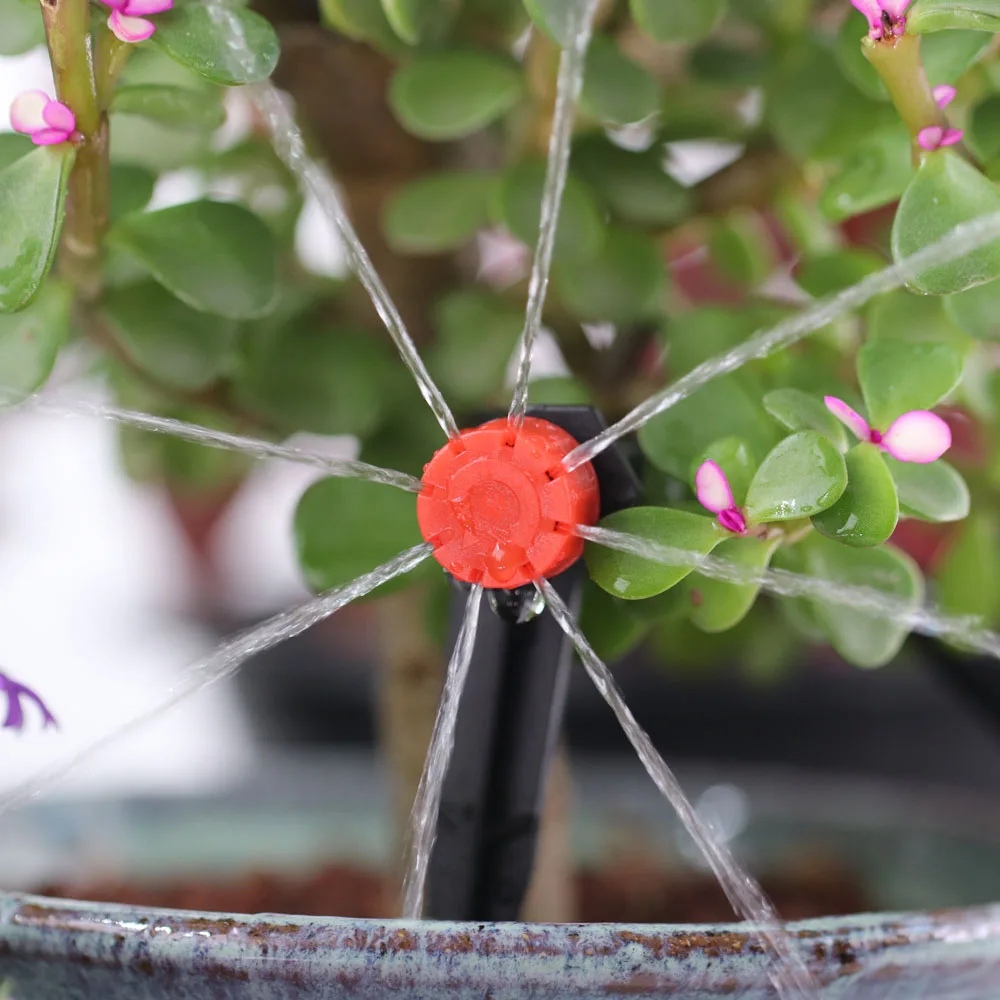 Direction for use: When a 60-watt pump operates at a pressure of 0.8 megapascals, its flow rate is approximately 5 liters per minute; for a 1/4-inch pipe, the flow rate is approximately 400 liters per hour; for drip irrigation Droper, the flow rate is approximately 0 – 80 liters per hour. Due to the limited water flow of the pump and the pipe, this irrigation system is not suitable for main pipelines with a diameter larger than 1/4 inch, a length exceeding 15 meters, and more than 10 sprinklers (each sprinkler has a flow rate of approximately 20 – 30 liters per hour). Recommendation: For systems of 15 – 30 meters, install 2 – 3 valves for batch irrigation (the number of sprinkler heads for each batch of drip irrigation pipes is less than 10).