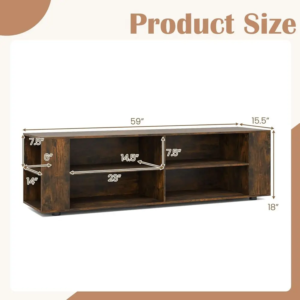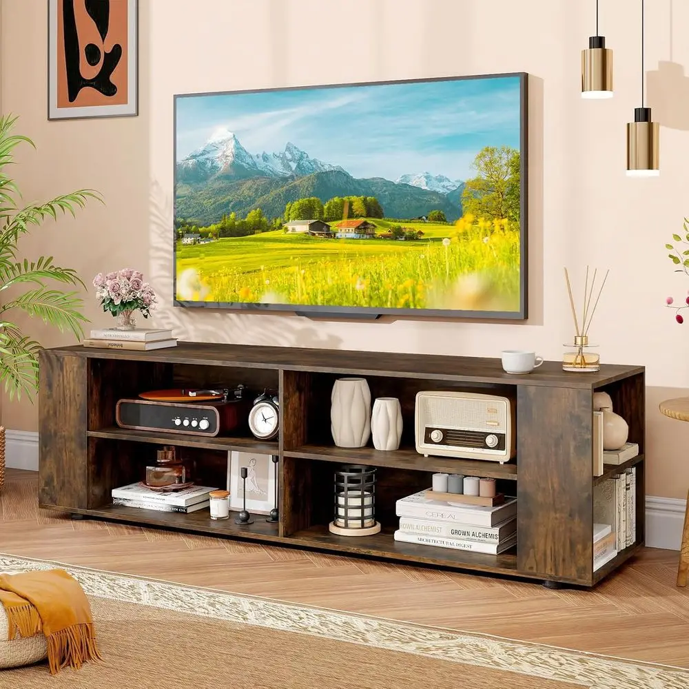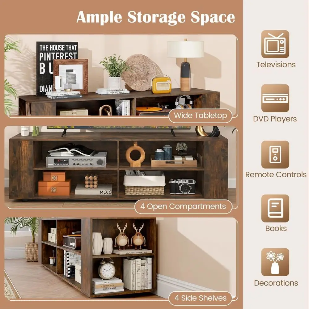 The TV stand offers ample storage with 4 open cubbies and 4 side shelves, perfect for organizing media devices, books, and decorative items. The 3-position adjustable shelves allow for versatile storage solutions to accommodate items of different heights and sizes.