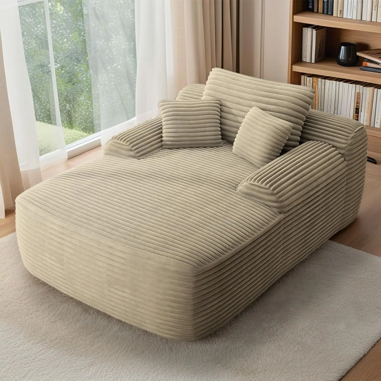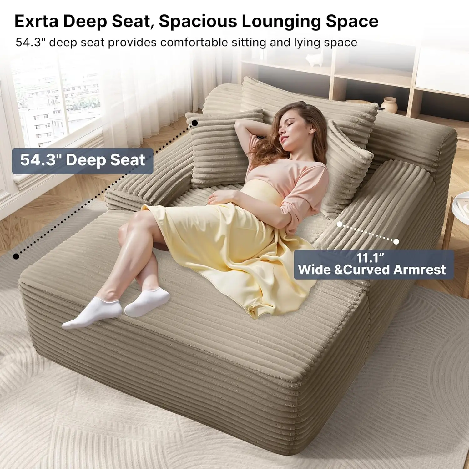 【Plush Corduroy Fabric】Oversized chaise lounge features skin-friendly, breathable corduroy fabric, offering a beautiful sheen along with an exceptional tactile experience, providing a more comfortable sitting and reclining experience.