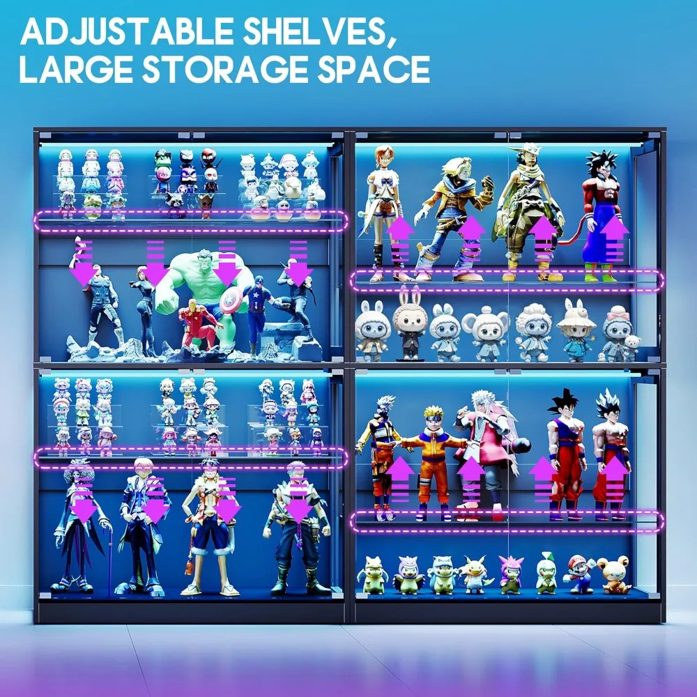 Elevate your display game with this modern glass cabinet featuring vibrant RGB LED lights and adjustable shelves. Perfect for showcasing collectibles, figures, books, or decor in style. **Key Features:** – **Smart RGB Lighting System:** Enjoy multiple dynamic modes including strobe, fade, smooth, and music-reactive effects. Control easily via app or remote to create the perfect ambiance for your collection. – **Adjustable Glass Shelves:** Includes 2 tiers of clear glass shelves that can be adjusted to fit items of various sizes. Each shelf supports up to 20kg (44 lbs), offering flexible storage solutions. – **Press-to-Open Glass Doors:** Sleek handle-free design with press-to-open doors provides easy access while maintaining a clean, modern look ideal for any room. – **Large Capacity & Dimensions:** Spacious interior measures 70 inches high x 45 inches long x 16 inches deep (178 cm H x 114 cm L x 41 cm D), accommodating numerous items without clutter. – **Easy Assembly:** Comes with a clear step-by-step manual and pre-drilled parts. Designed for efficient setup by two people in minimal time. **Benefits:** – Enhances visibility and appeal of your collectibles with bright, customizable lighting. – Keeps items dust-free and organized on smooth, easy-to-clean glass surfaces. – Versatile for use in living rooms, offices, or retail spaces as a stylish display or storage unit. **Ideal For:** Collectors of action figures, models, books, trophies, or anyone looking to add a touch of elegance to their home or workspace. Transform your space into a professional showcase today!
