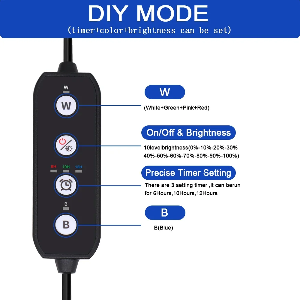 2. In DIY mode, there are 3 timer mode, 6Hours, 10Hours, 12Hours. You have 3 colors modes choose of white/red/green/pink, white/red/green/pink/blue, only blue. (2-channel control of the white/red/green/pink and blue leds)10 light intensity you can dimmer from 10%-20%-30%-40%-50%-60%-70%-80%-90%-100%. If you have over bright issues, you can adjust the lighting brightness via the built-in dimmer. Aquarium light fixture color and brightness of can be set freely according to your preferences. Please choose the color and brightness before choose the timer function.