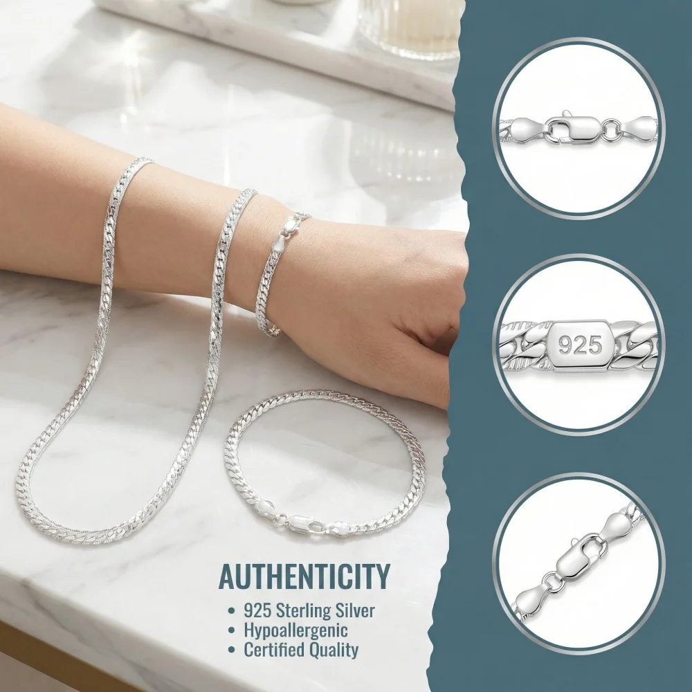 New 925 Sterling Silver 2 Piece Full Sideways Chain Necklace Bracelet For Women Men Fashion Jewelry Sets Wedding Gift
