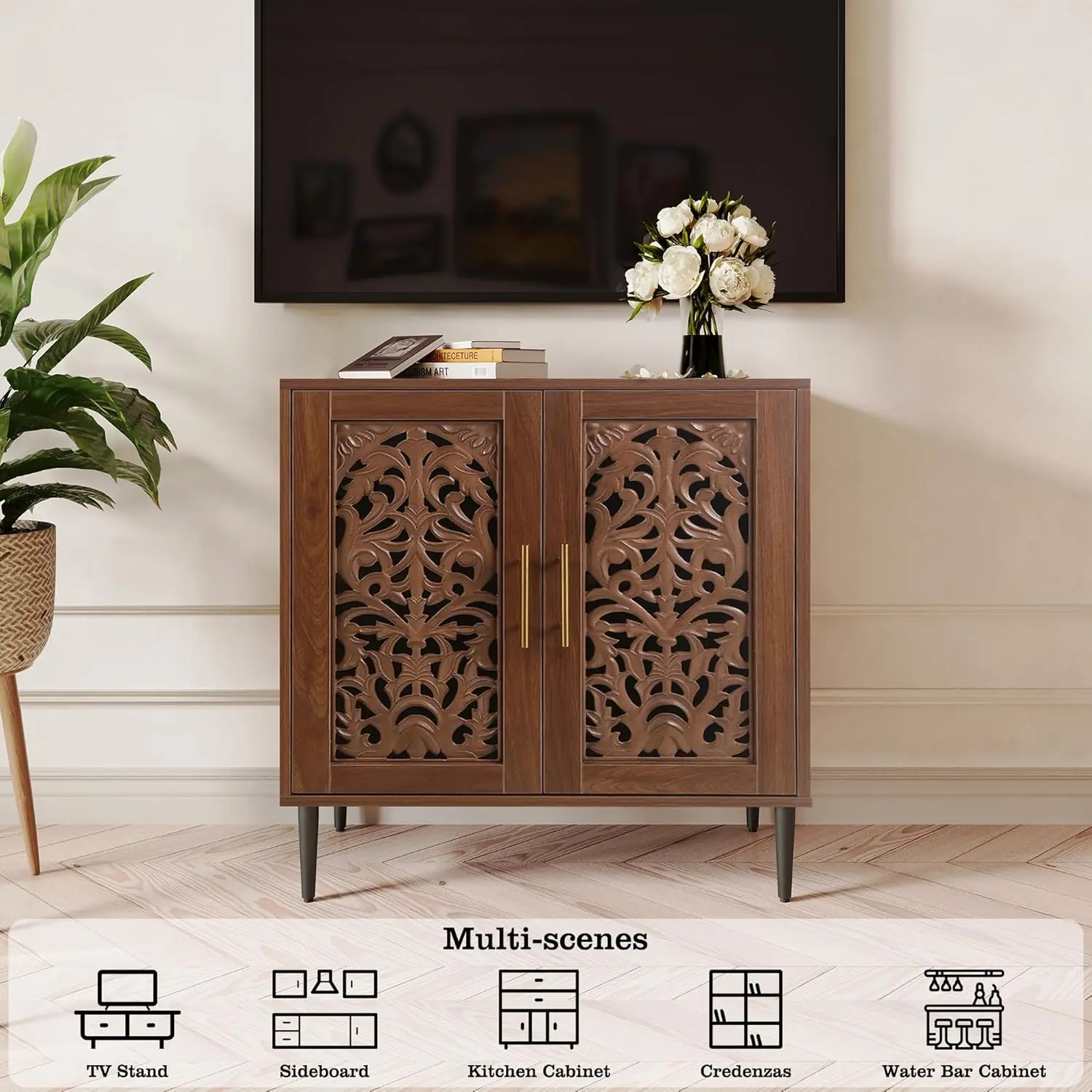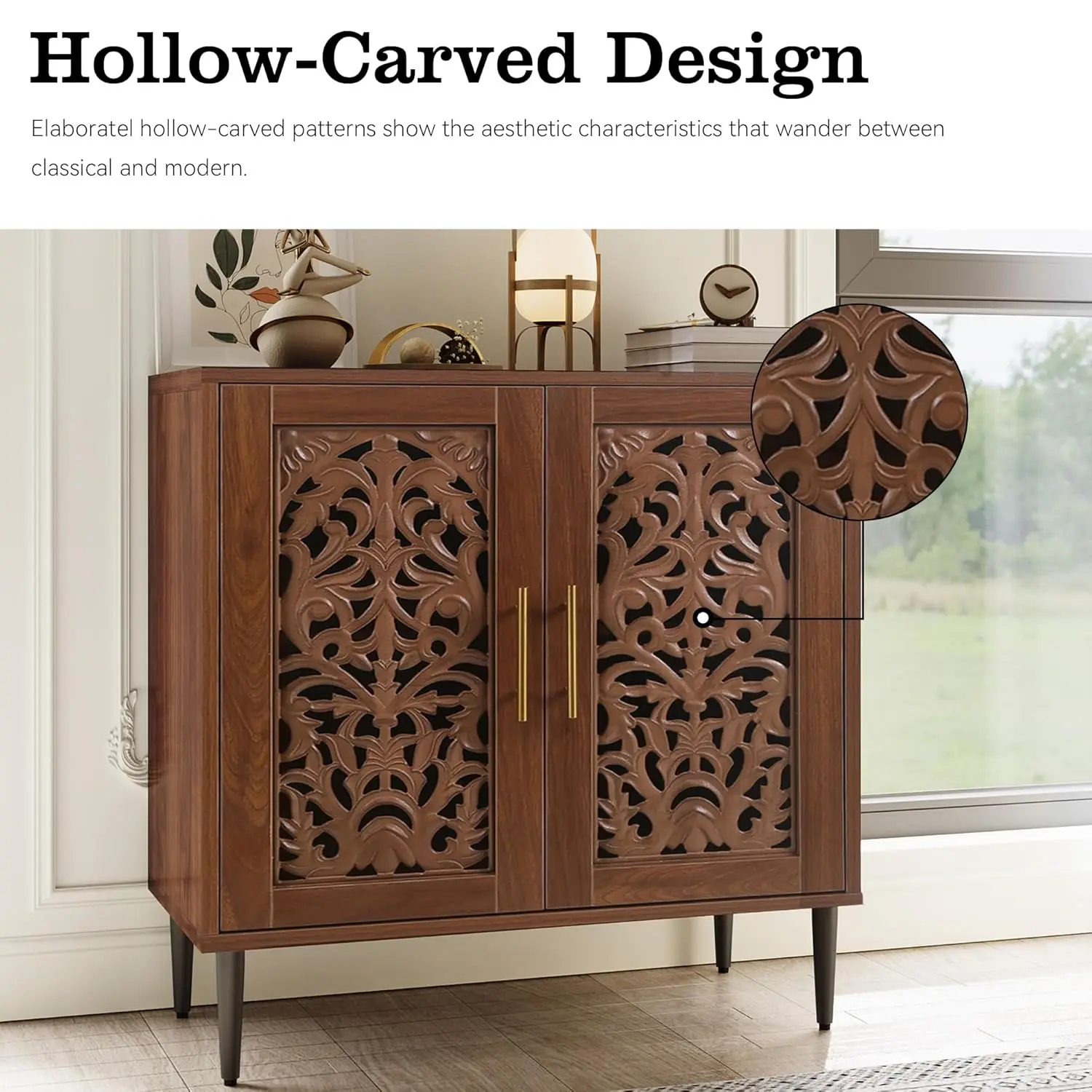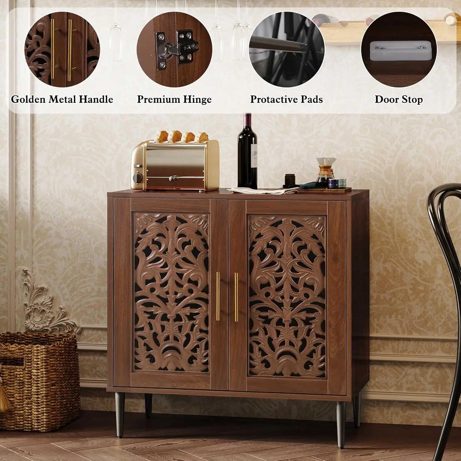 𝑴𝒖𝒍𝒕𝒊-𝒇𝒖𝒏𝒄𝒕𝒊𝒐𝒏𝒂𝒍 𝑪𝒂𝒃𝒊𝒏𝒆𝒕 – Exquisitely carved design, vintage style, proper size make it suitable for many scenes. You can use it as coffee/water bar cabinet, kitchen storage cabinets, entryway furniture, or credenza. Really ideal furniture for your kitchen, dining room, living room, and entry. You can easily enjoy vintage vibe and function.