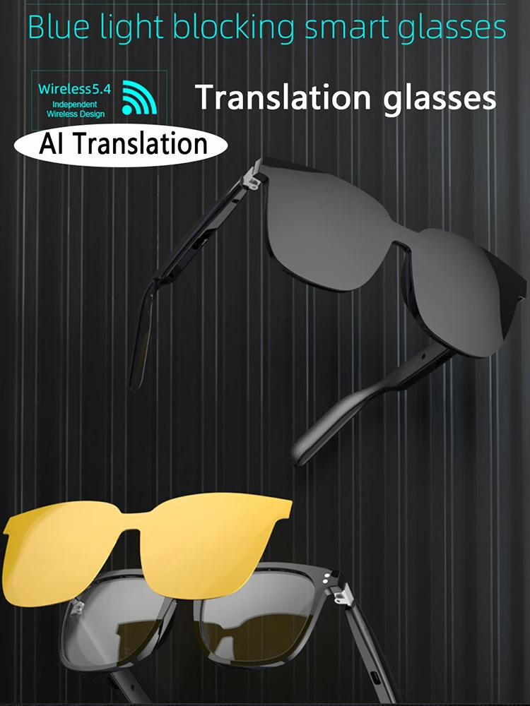 Features: 1.144 Language Real-Time Translation: Supports 144 languages with a remarkable translation accuracy of up to 99%, covering most countries and regions globally. Ideal for international communication needs with AI smart translate eyeglasses. 2.Bluetooth 5.4 Technology: Utilizes Bluetooth-compatible 5.4 for smooth audio, compatible with various Android devices, ensures fast and stable connection without interruptions, enhancing intelligent translator glasses functionality. 3.Clear HD Calls: Built-in HD microphone and speakers ensure clear communication, enhancing experience. Your audio music call sunglasses allow making calls and listening to music without extra devices seamlessly. 4.Versatile Usage: for music, calls, gaming, TV watching, home office, and outdoor activities, these magnetic frame sports sun glasses are your smart assistant in daily life and work. 5.Comfortable Wear: Crafted from lightweight, skin-friendly, and sturdy materials for all-day comfort. The flexible polarized lens smart glasses frame fits various face shapes, ensuring a safe and comfortable experience. Specification: