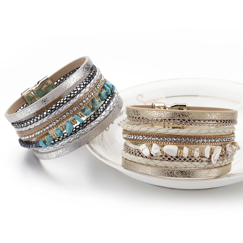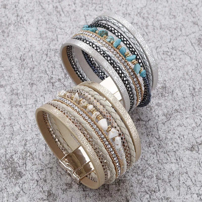 Item:ALLYES Natural Stone Leather Bracelet for Women Charm Retro Multilayer Crystal Snake Skin Wide Bracelets & Bangles Jewelry Gifts