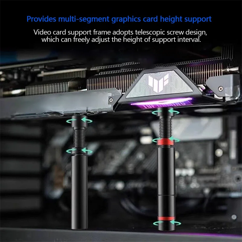 - The graphics card support bracket adopts a telescopic screw design, which can freely adjust the height of the support section and can be used by attaching it to the chassis floor or power compartment at the bottom