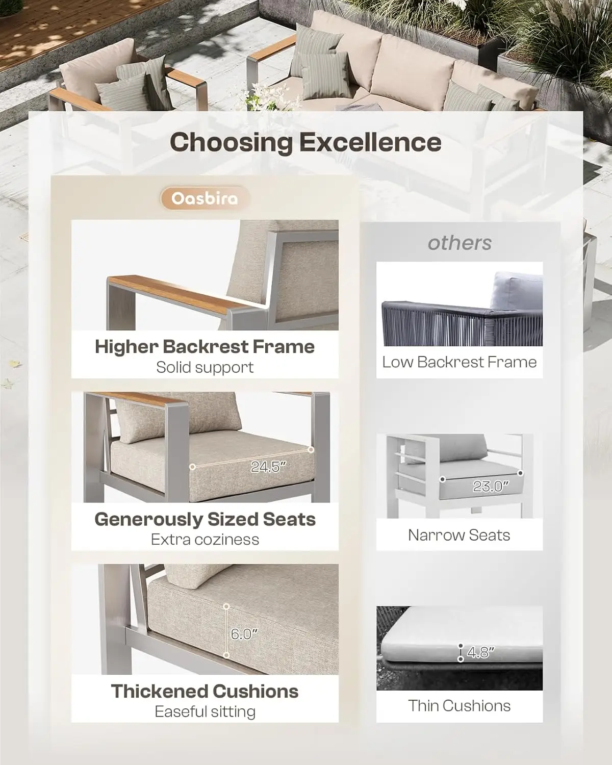 【Spacious Seating】 Please check if your patio furniture set belongs to , we cannot be responsible for the quality of products that do not belong to us. With a 30.8 inch backrest for enhanced support, this oversized patio furniture provides stability far beyond average sofas. Each seat features a 24.5 inch width and 27.5 inch depth, offering ample room for ultimate relaxation in your outdoor space.