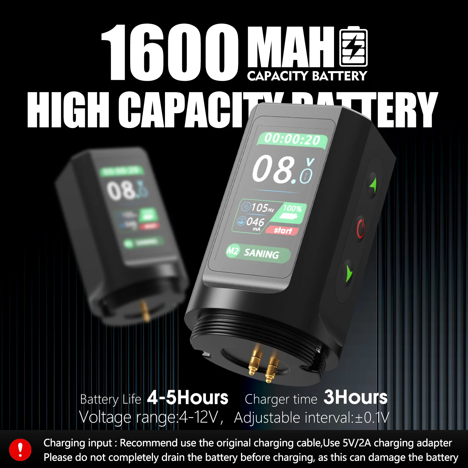 -Battery:1600mAh, The Machine Offers 3-4 Hours Of Tattooing And Quickly Recharges in 1.5-2 Hours.