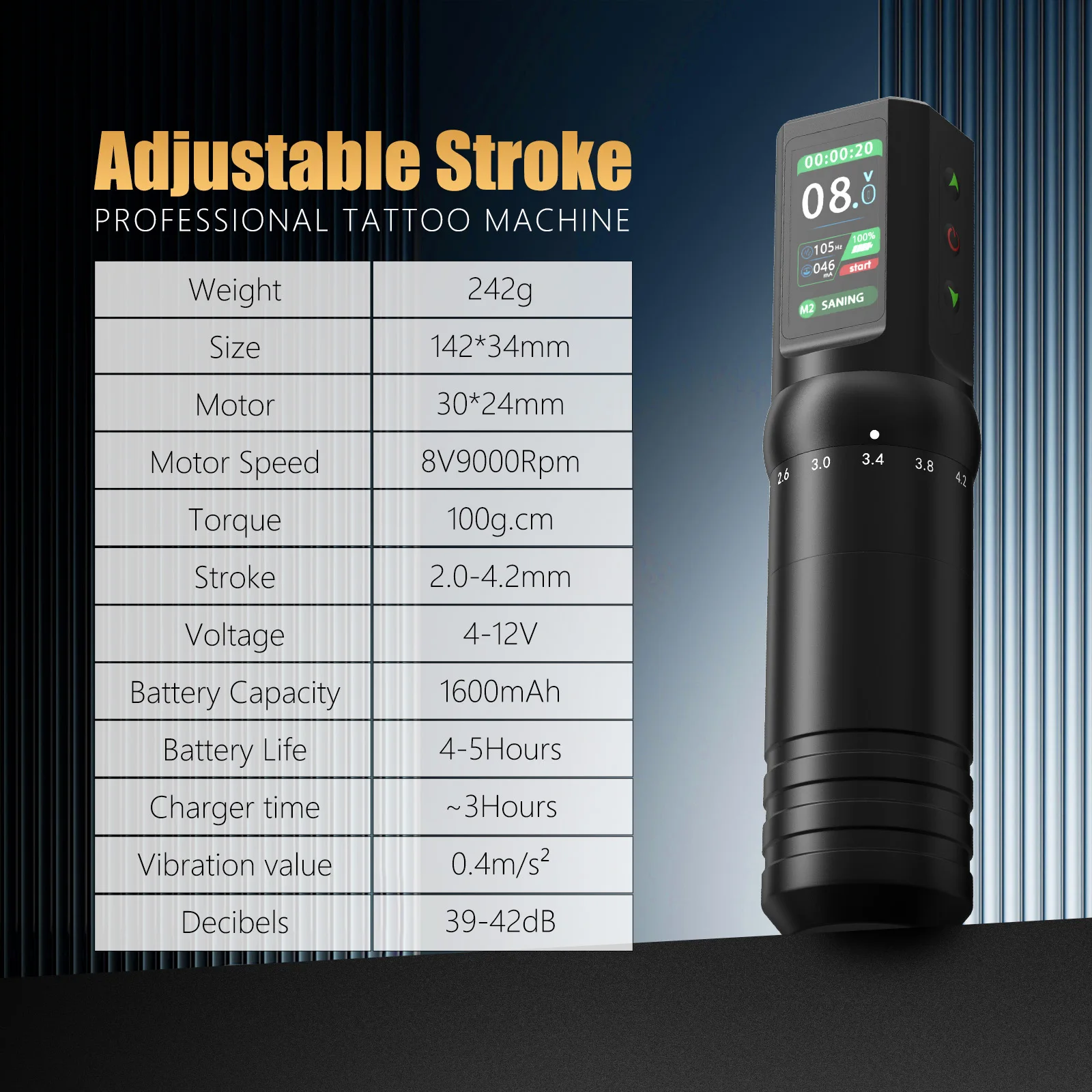 -Adjustable Stroke:7 Adjustable Strokes (2.0-2.3-2.6-3.0-3.4-3.8-4.2mm) for Versatile Tattooing, Ensuring Precision for Detailed Dotwork.