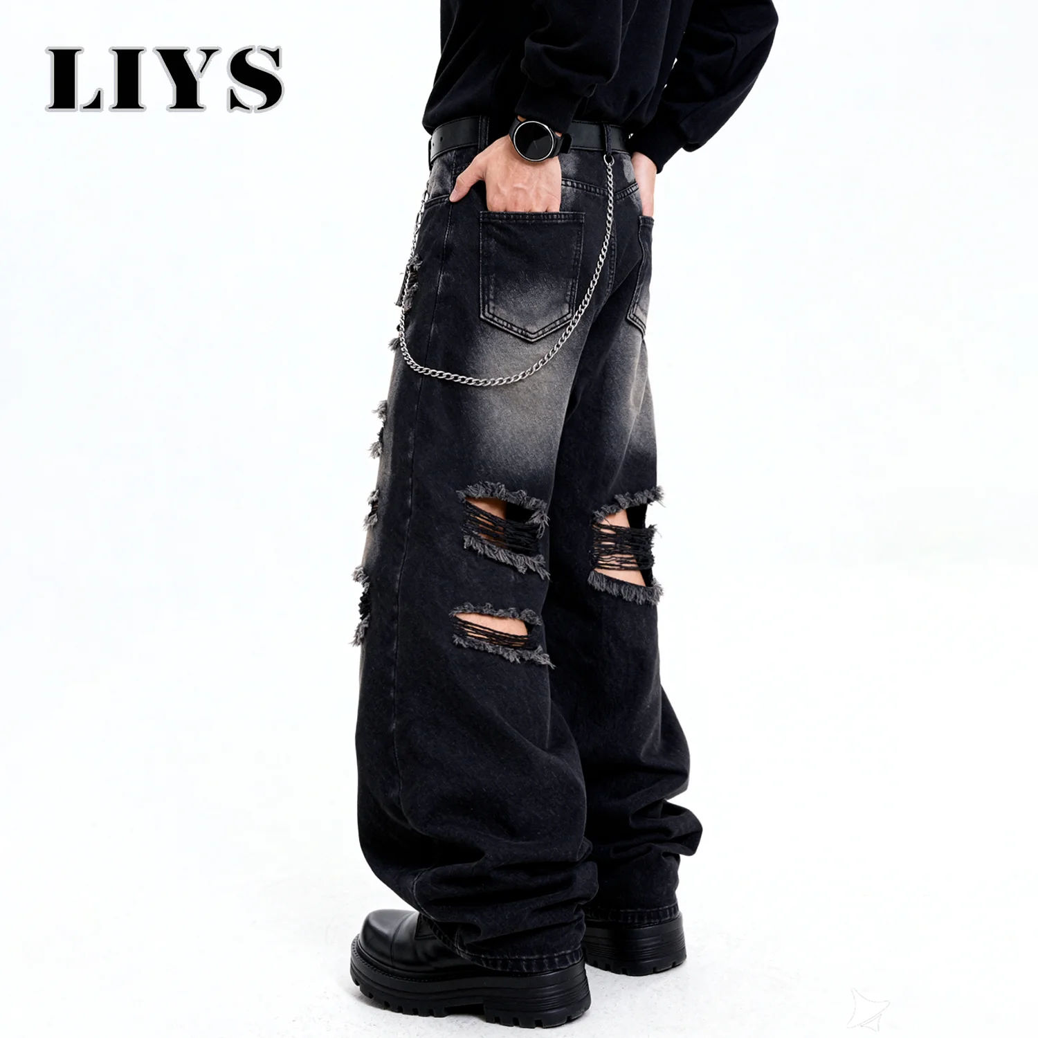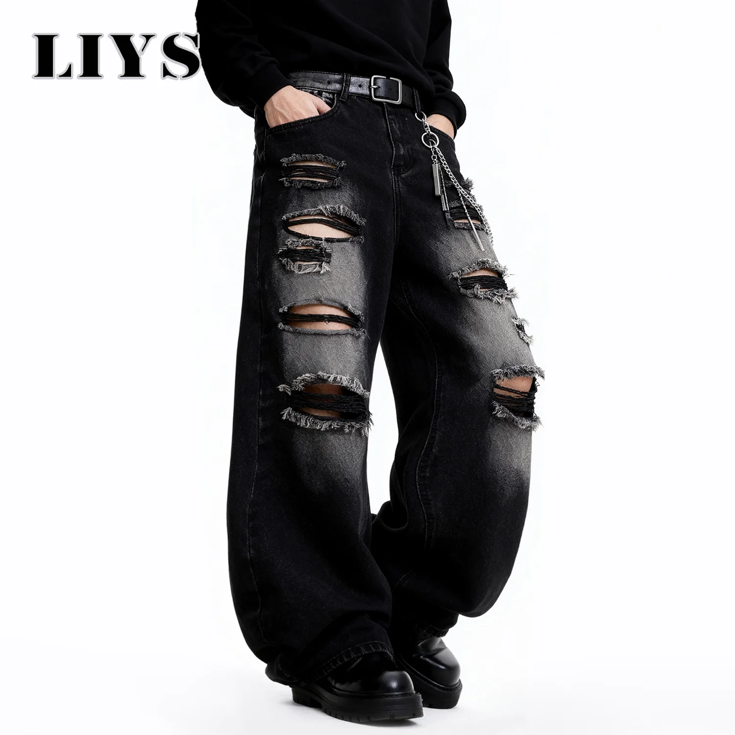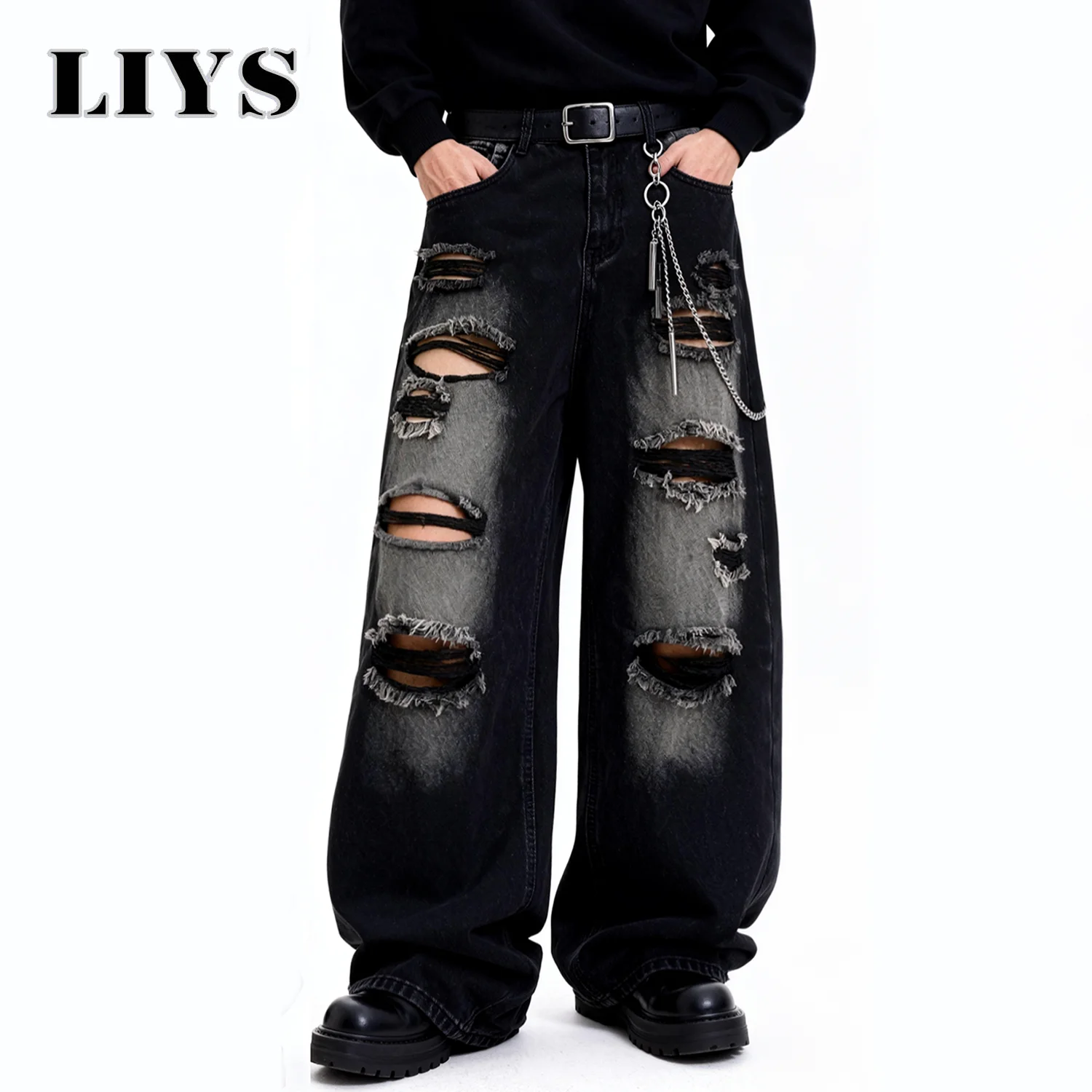 Occassion:Elevate your street style with these Distressed Black Denim Jeans – a bold statement piece for the fearless fashionista.Crafted with extreme ripped details, these jeans blend grunge vibes with modern flair. The ultra-baggy silhouette ensures effortless comfort, while the frayed edges and layered rips add an edgy, lived-in look. Accentuated with a trendy chain accessory, they’re perfect for those who dare to stand out.Pair them with a sleek hoodie and chunky boots for a full Y2K-inspired ensemble, you’ll own the streetwear game. Embrace individuality and make every step a fashion statement.