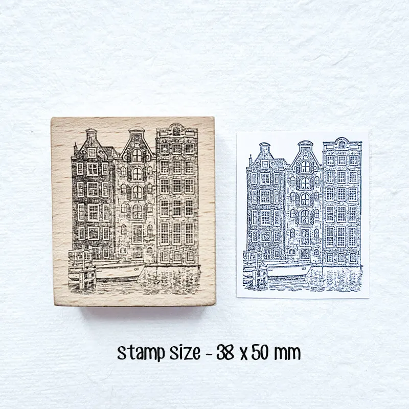 Capture your Amsterdam memories with this charming wooden stamp featuring iconic canal houses. Perfect for travel journals, scrapbooks, and creative projects, this stamp brings authentic Dutch architecture to your pages. The detailed design showcases the distinctive gabled rooflines that define Amsterdam's waterfront character.