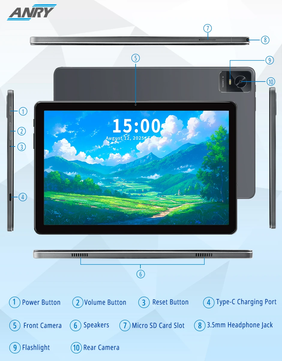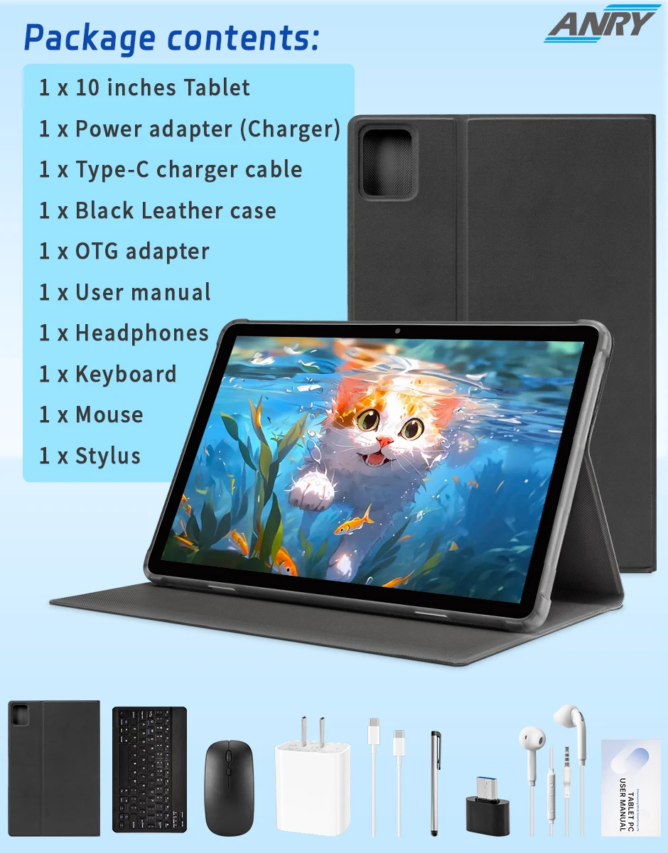 【2 in 1 Tablet+12Months Warranty】The ANRY tablet comes with a Bluetooth keyboard, wireless mouse, and foldable protective case, allowing you to flexibly transform the tablets into laptop mode or computer mode. The package 2 includes: 1 x 10.1 inch tablet, 1 x keyboard, 1 x mouse, 1 x Stylus, 1 x foldable protective case, 1 x Headphones, 1 x OTG adapter, 1 x USB-C charger cable, 1 x user manual.
