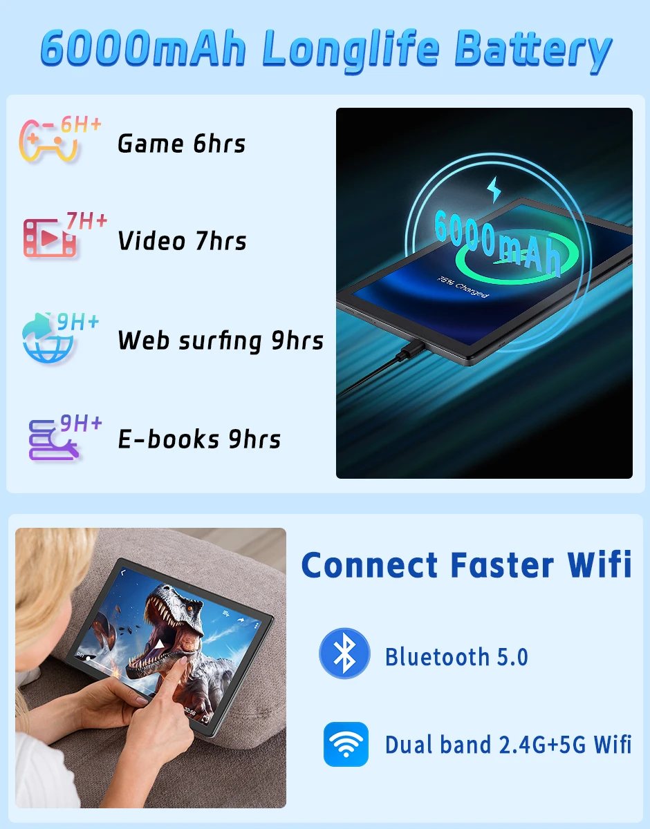 【8-core CpuTablet + 6000mAh High Capacity】Android 15 tablet can provide the ultimate mobile gaming experience. Its octa-core GPU making mobile games more visually stunning. The 6000mAh large-capacity battery allows you to enjoy movies, TV series, music, etc. for a long time with confidence. Battery life has never been better!