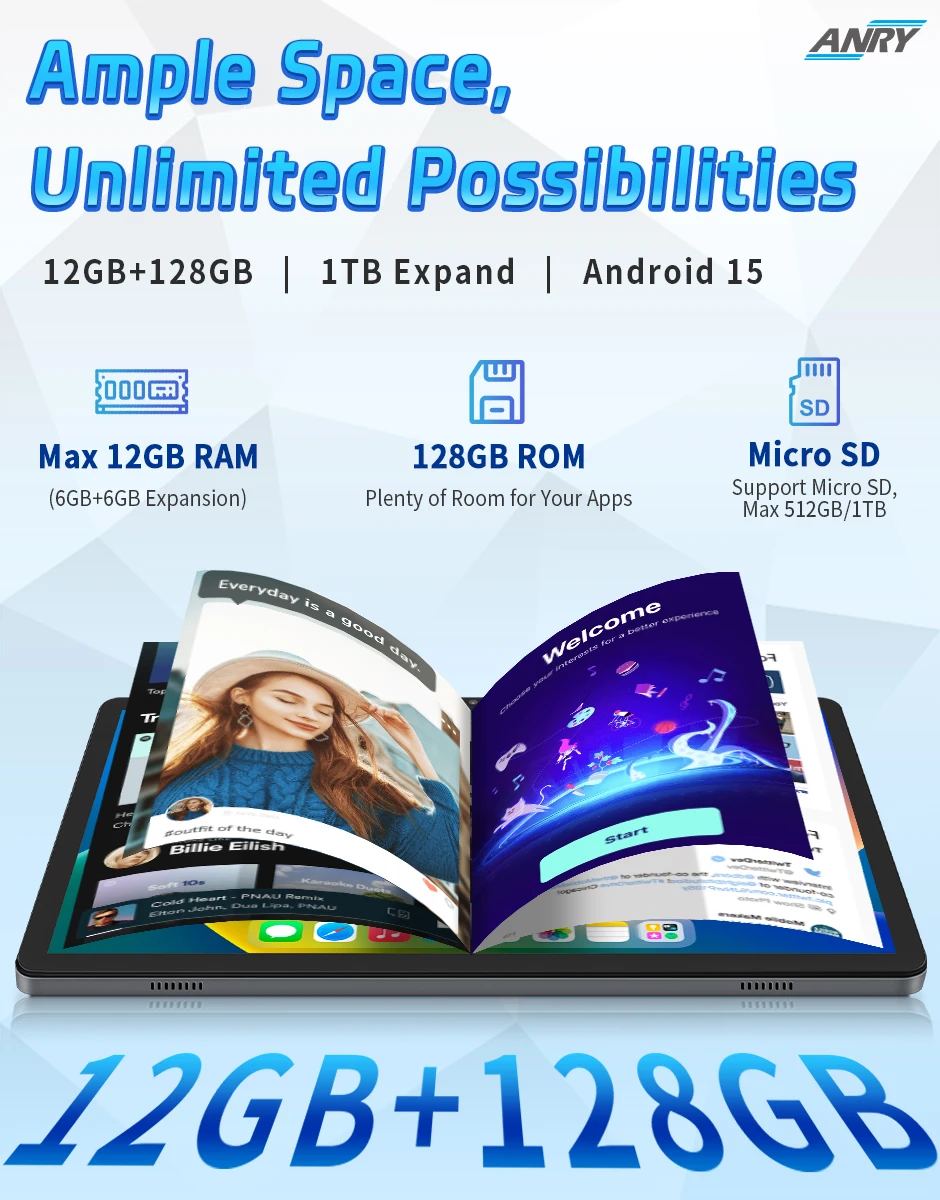 【Android 15 Tablet, 12GB RAM +128GB ROM】New large-capacity Android 15 tablet 12GB RAM (6GB RAM + 6GB extend), 128GB ROM allows you to store more photos and documents. A micro SD card slot expands storage up to 1TB (sold separately) so you can store all your favorite media files together, including ebooks, videos, photos. Android 15 and GMS certified, allowing you to download popular apps from the Google Play Store